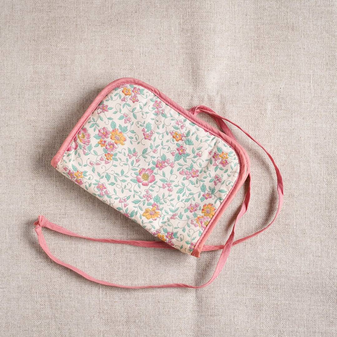 This hand-stitched portable jewellery case features a charming botanical print framed by muted pink piping—an aesthetic that carries a soft nostalgia, as though it has traveled through time with kindness and care. The gentle texture of the fabric and the quiet irregularity of the hand-sewn stitches give it a warmth that machine-made pieces simply cannot replicate, making it feel like a small keepsake passed lovingly from one generation to the next.