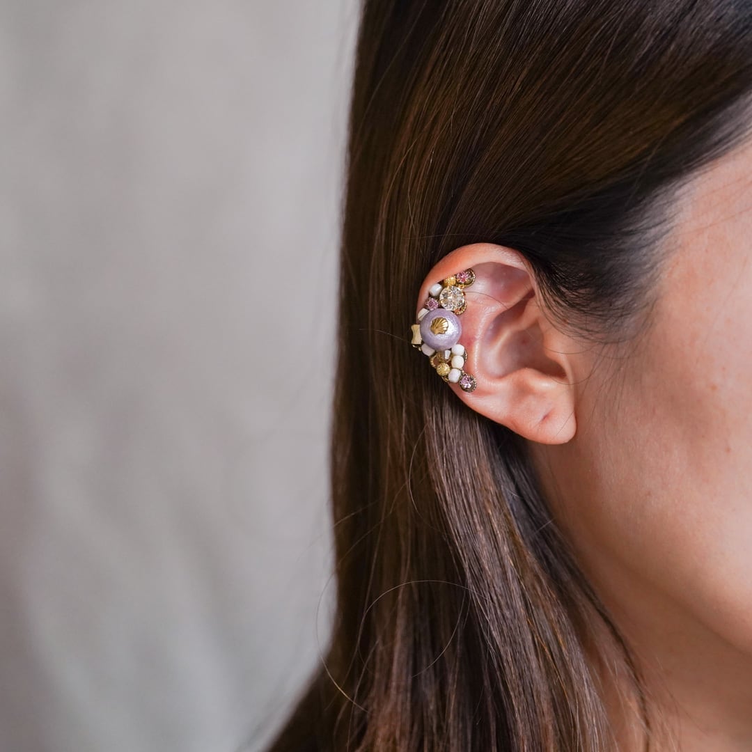 中心に配されたライラックトーンのパールは、表面がほんのりと艶をたたえ、見る角度によって柔らかく光を跳ね返します。そのトップには小さなシェルモチーフのようなエンブレムが添えられており、まるで海辺で拾った小さな宝物のような親密さを感じさせてくれます。周囲にはホワイトやゴールドのパーツ、淡いピンクストーンが散りばめられ、全体がふんわりと光をまとうような優しいルミナンスに満ちています。強さではなく、重ねた光の“やわらかさ”で魅せるイヤリングです。