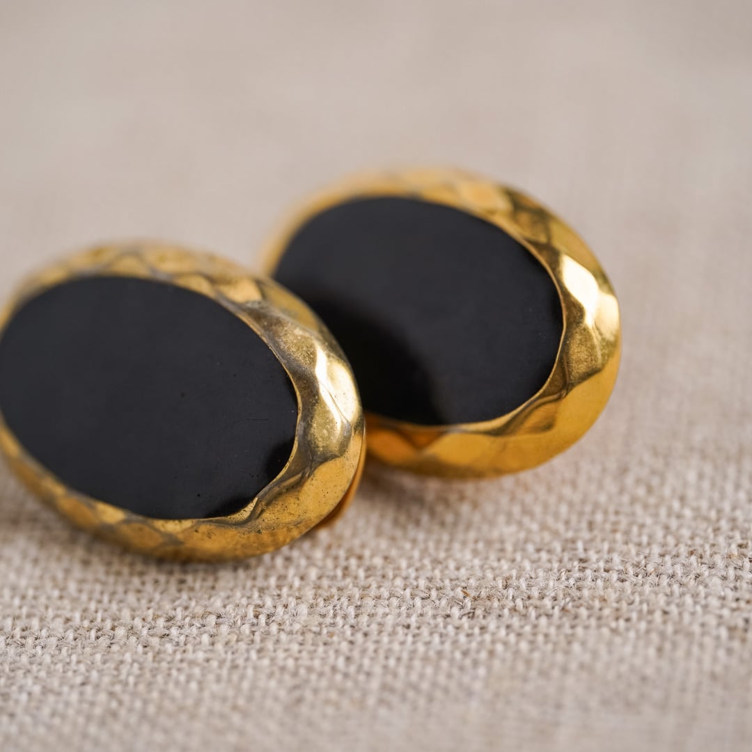 A striking vintage pair of earrings where matte black enamel is framed by uniquely textured gold-tone metal. Although relatively large in size, the stripped-down, minimalist design keeps the overall expression restrained and quietly refined. What truly sets this piece apart is the character of the metal frame itself—its subtly irregular, organic surface catches light softly, giving depth and nuance that pure geometry could never achieve.