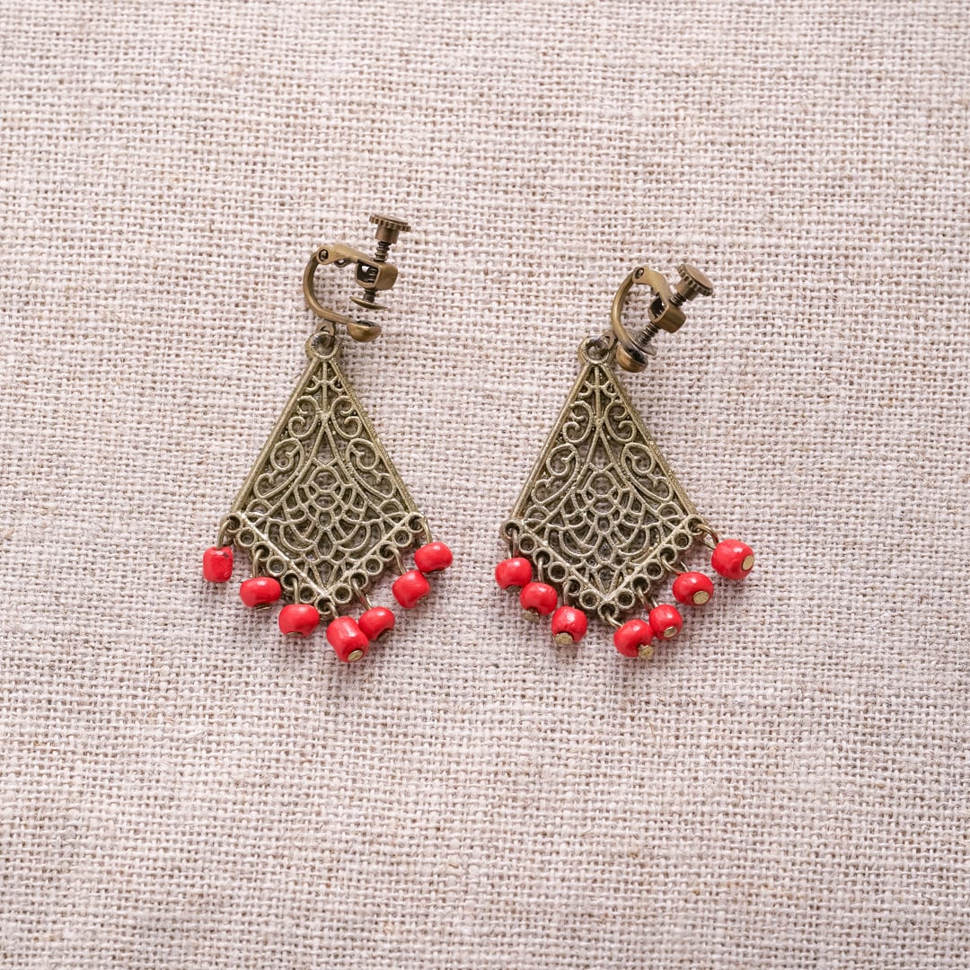 繊細な透かし模様のメタルワークに、小粒のレッドビーズを連ねたヴィンテージイヤリング。