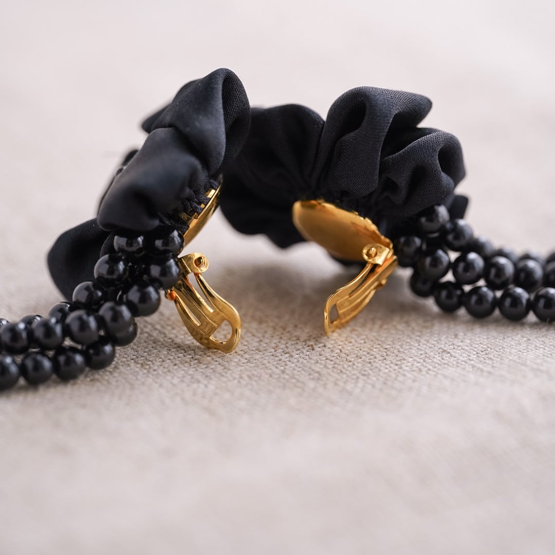 These vintage earrings feature matte black floral motifs paired with delicate beaded tassels, creating a quietly striking silhouette.