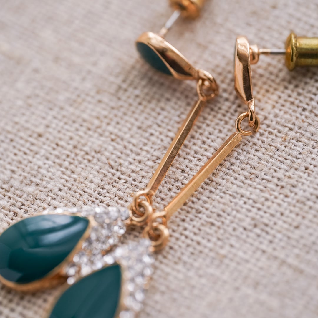 深みのあるグリーンのティアドロップモチーフが印象的な、ヴィンテージイヤリング。