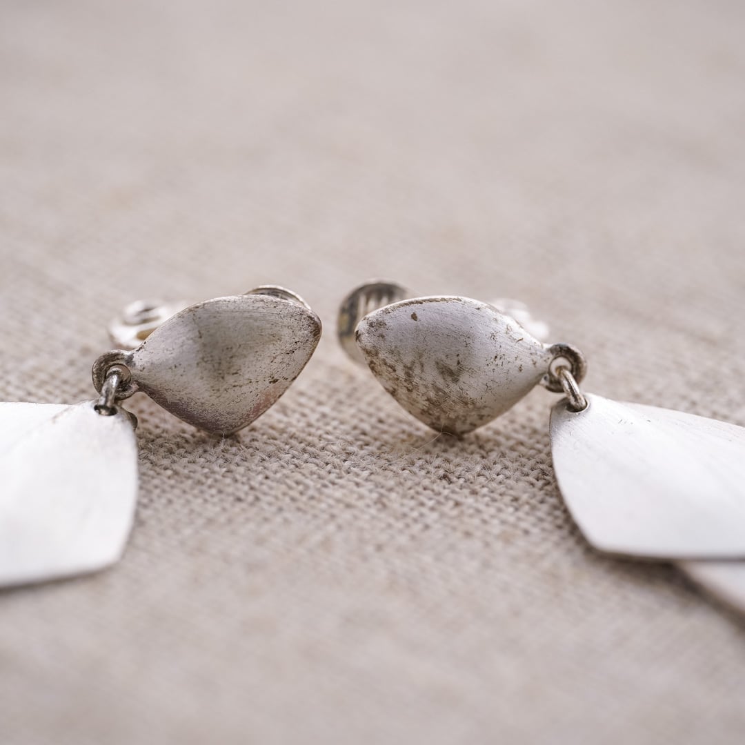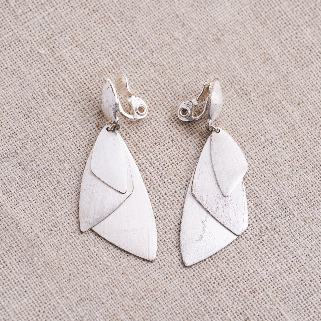 These silver-toned drop earrings feature an abstract, layered silhouette that feels both sharp and quietly spacious.