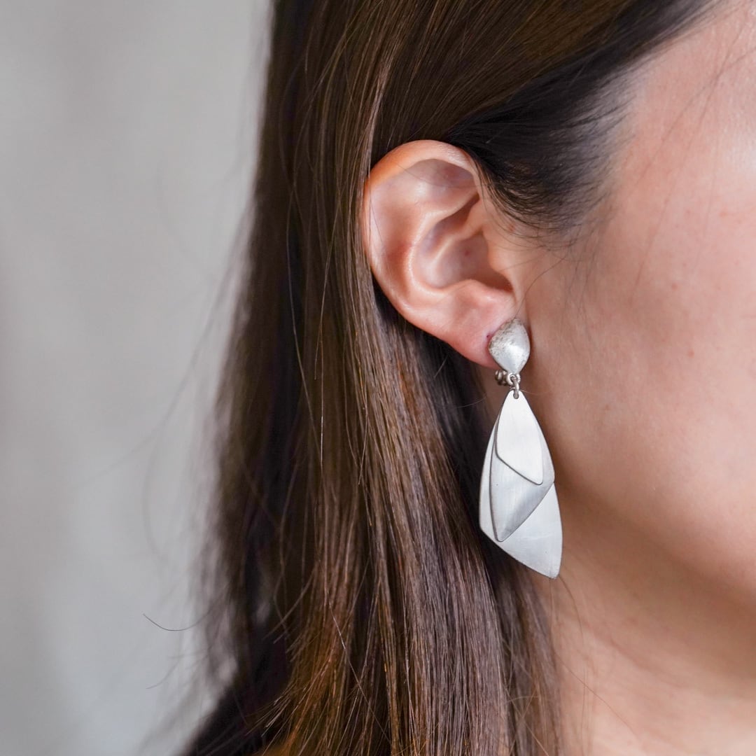 シャープでありながら、どこか余白を感じさせるシルバートーンのドロップイヤリング。