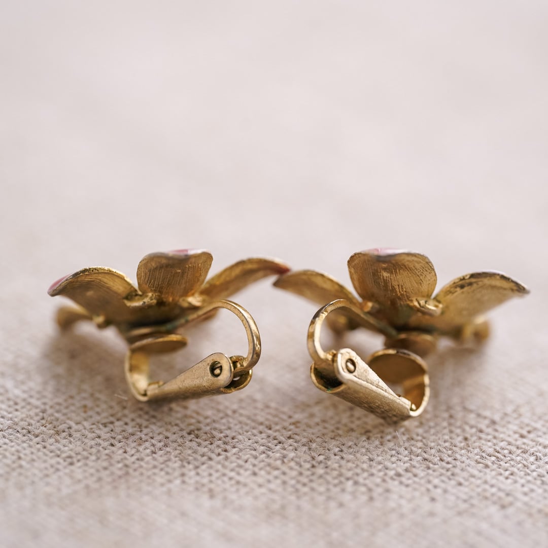 These earrings feature a delicate floral motif rendered in soft pink enamel tones.