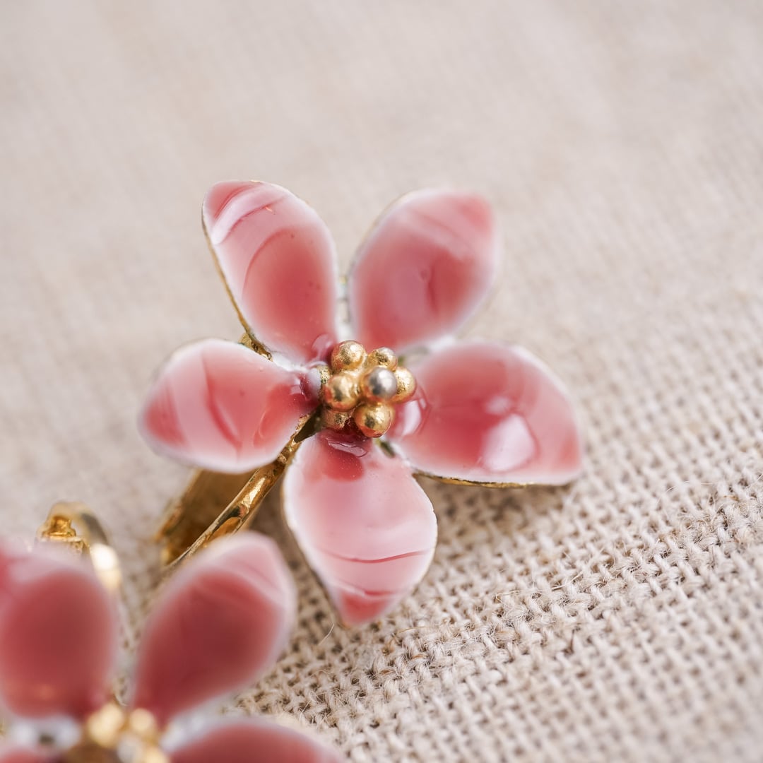 やわらかなピンクトーンのエナメルで表現された、フローラルモチーフのイヤリング。