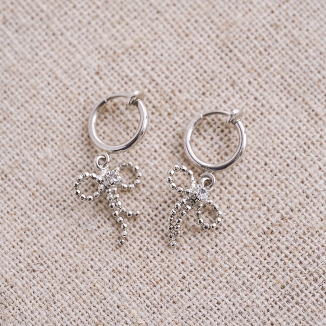 小さなフープから、リボンのようなモチーフが静かに揺れるシルバーイヤリング。
