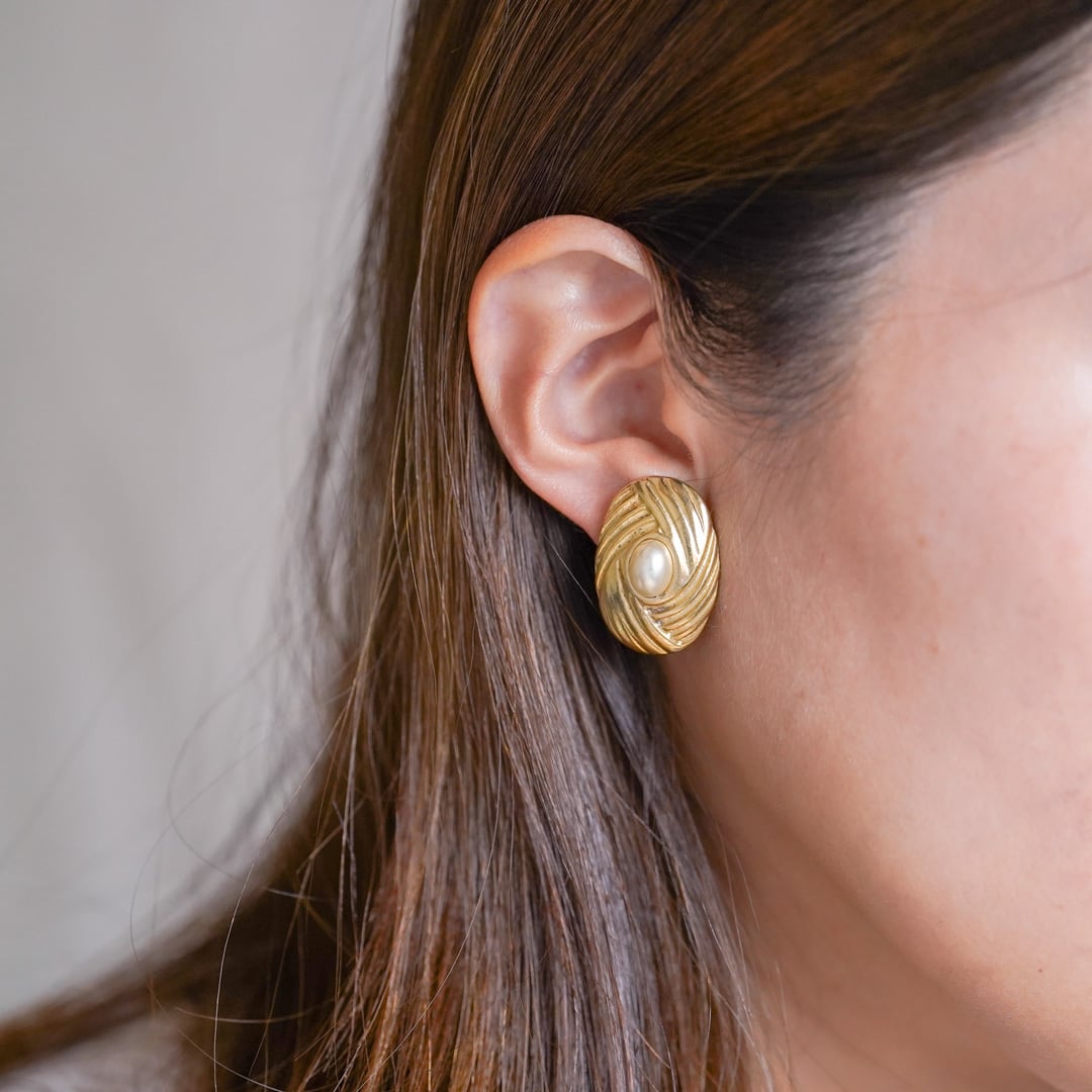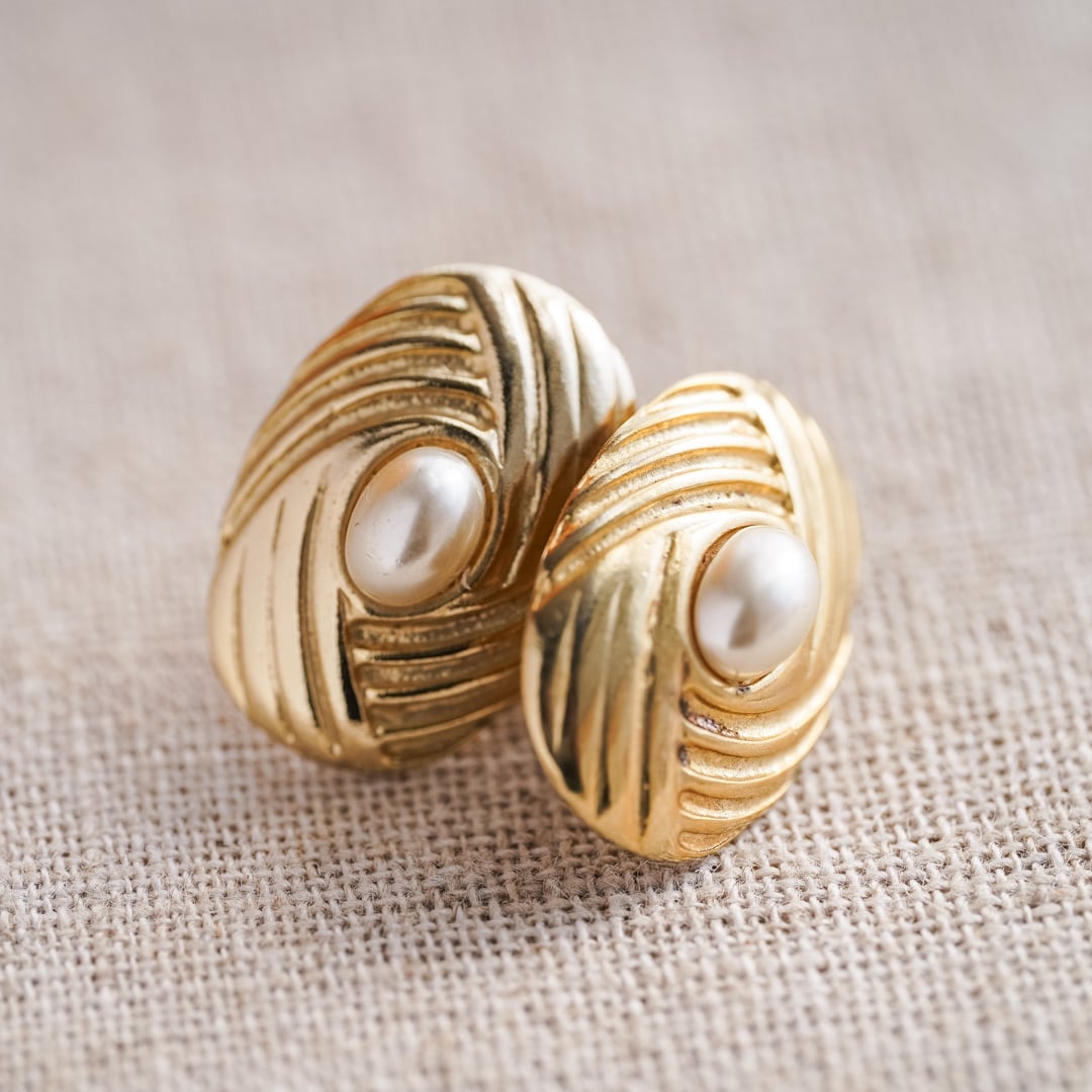 やわらかな曲線が重なり合い、中心にパールを抱くように配されたヴィンテージイヤリング。