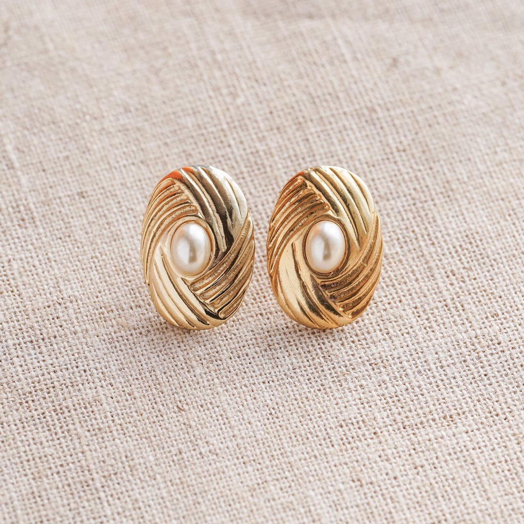 Vintage earrings composed of softly layered curves, gently cradling a pearl at their center.