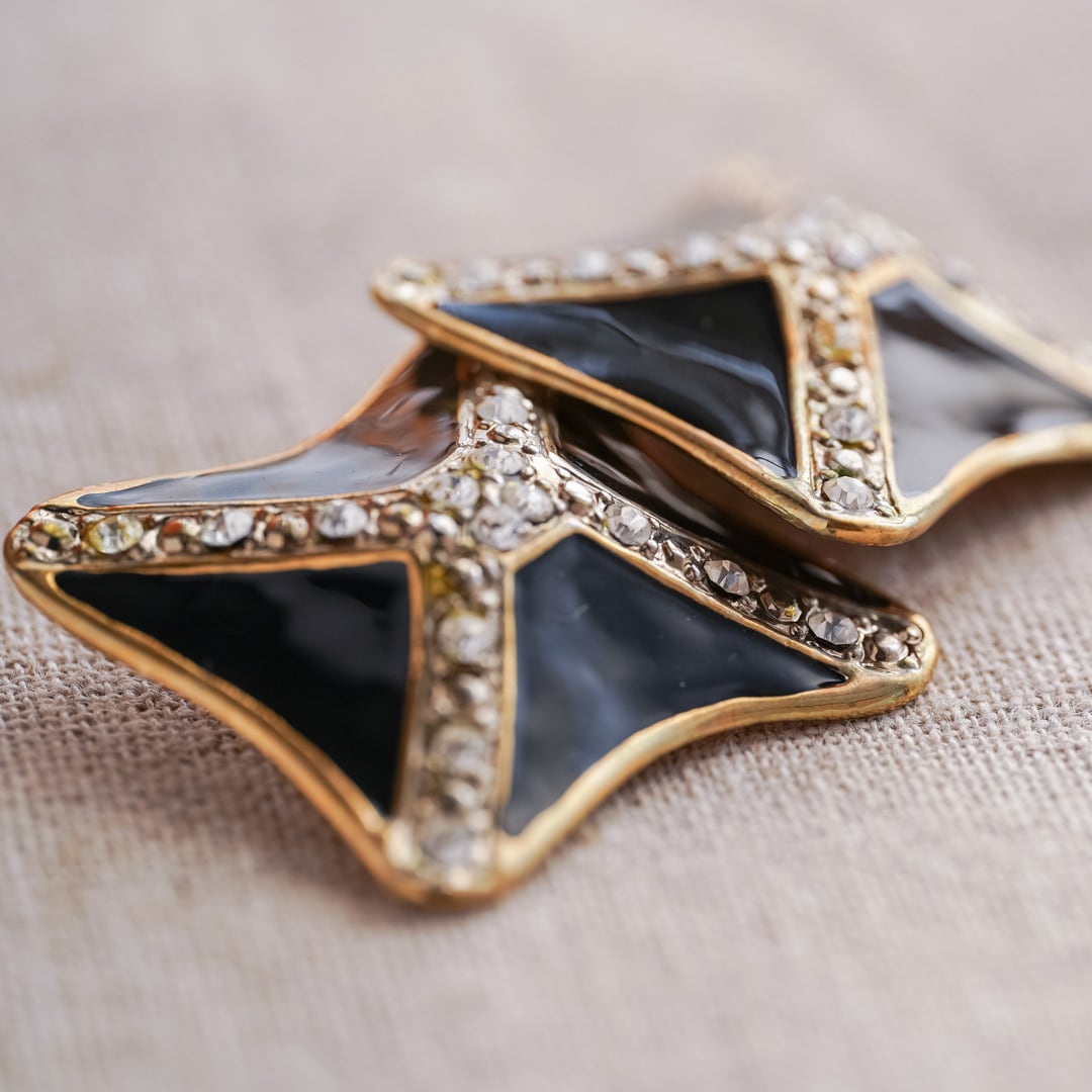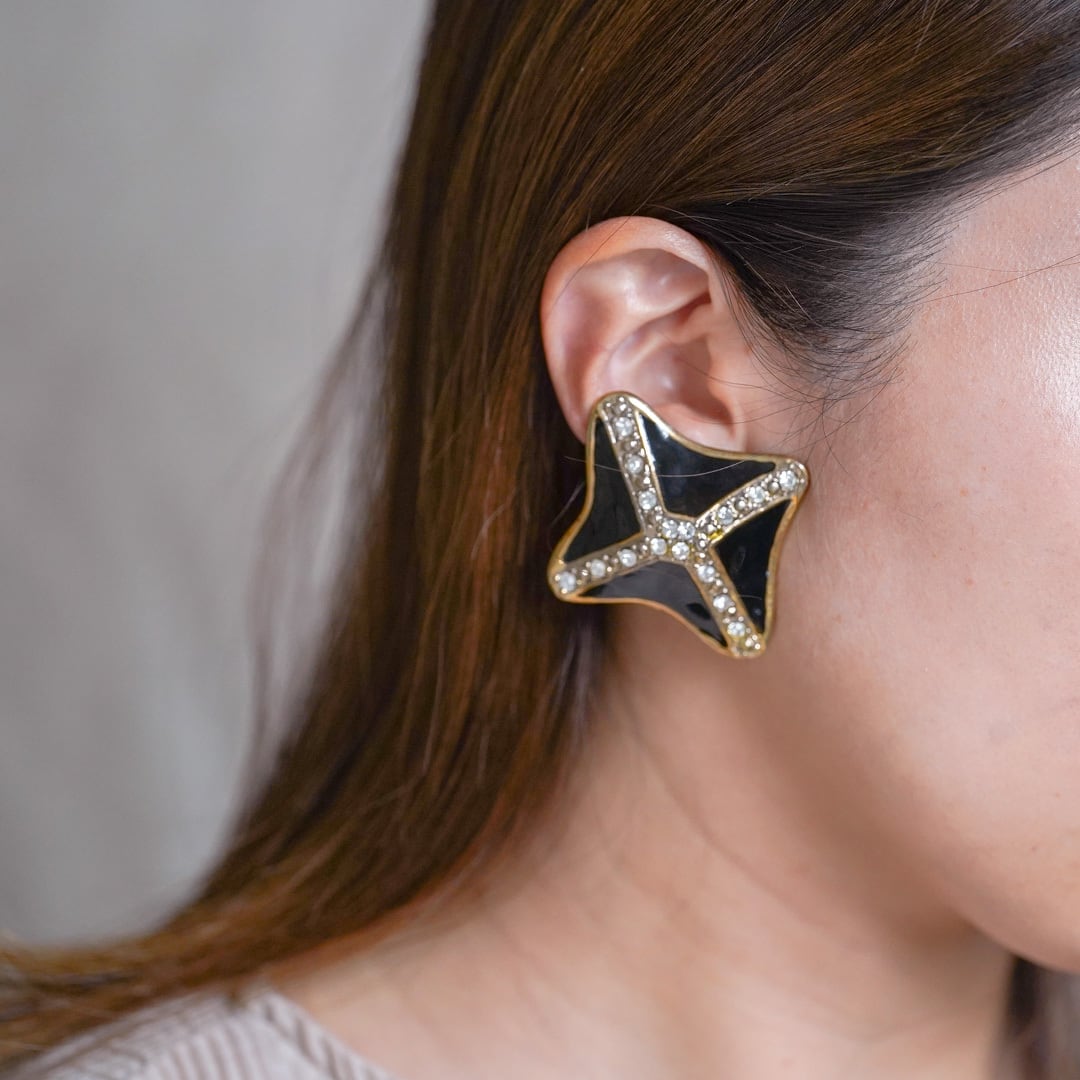 These earrings feature a bold, star-like silhouette that feels architectural and modern, softened by gently rounded edges and a carefully considered scale. The deep black enamel grounds the design, while fine lines of rhinestones trace the form, adding a controlled shimmer without overpowering the structure.