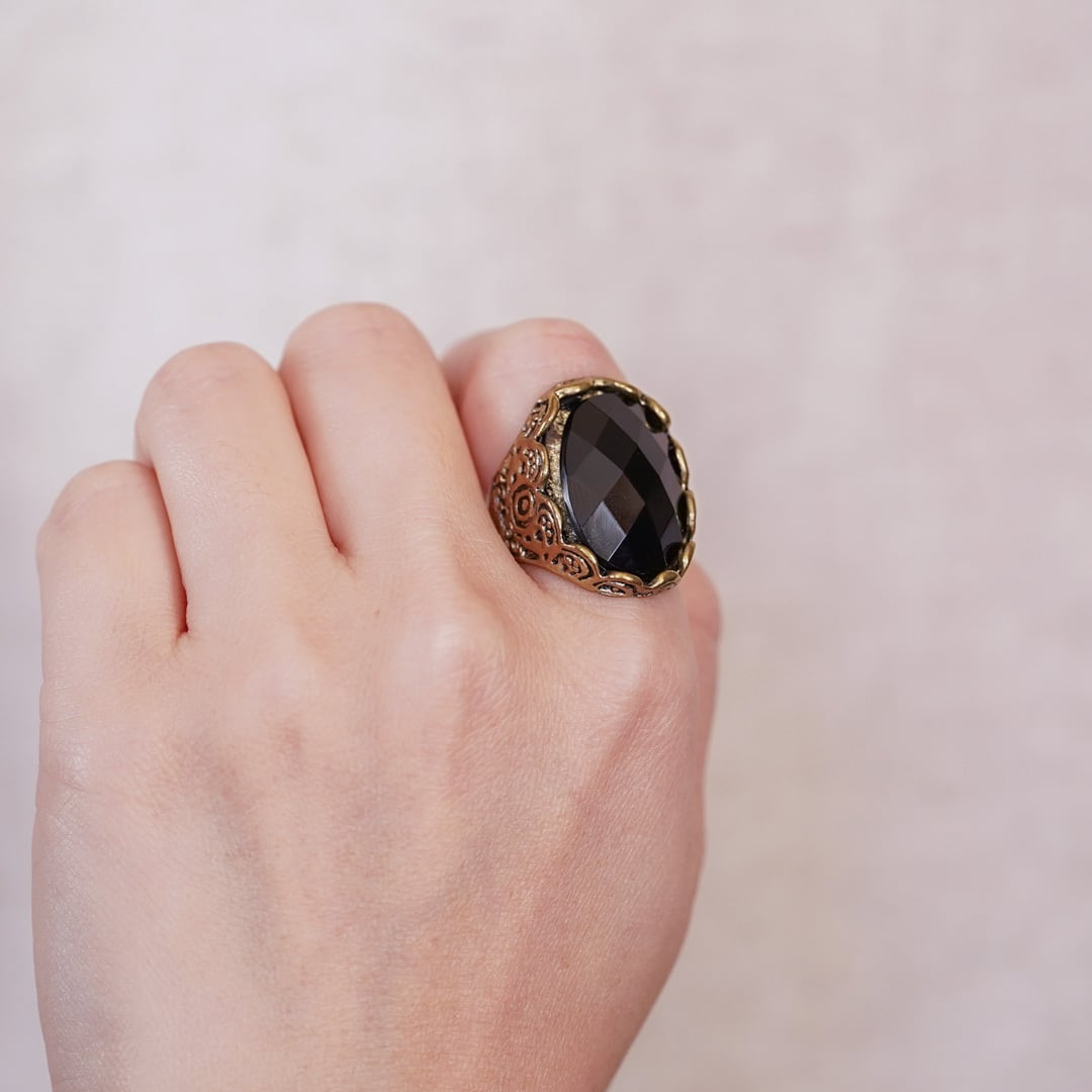 This vintage ring features a bohemian crown design, combining bold volume with an unmistakable sense of refinement. At its center sits a faceted black stone, whose depth and subtle shimmer shift with the light, offering a quiet yet commanding presence on the hand. Rather than dazzling outright, the stone draws the eye inward, creating a sense of mystery and composure.