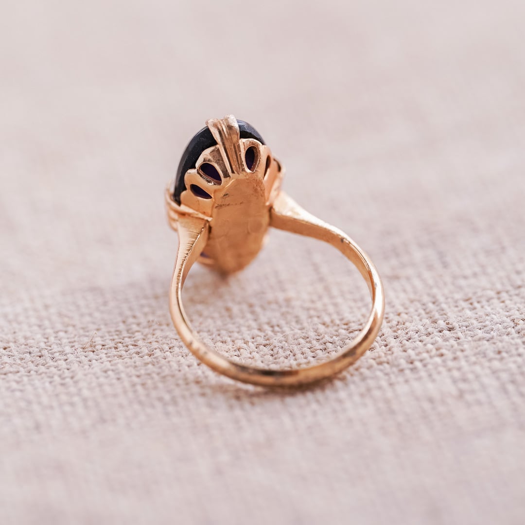This vintage ring features a classic oval cabochon cut, a timeless style prized for its smooth, domed surface and understated elegance. Free of facets, the polished black stone reveals its beauty through depth rather than sparkle, reflecting light softly and creating a calm, almost meditative presence. Its lustrous surface draws the eye in quietly, offering a sense of depth that feels both refined and enduring.