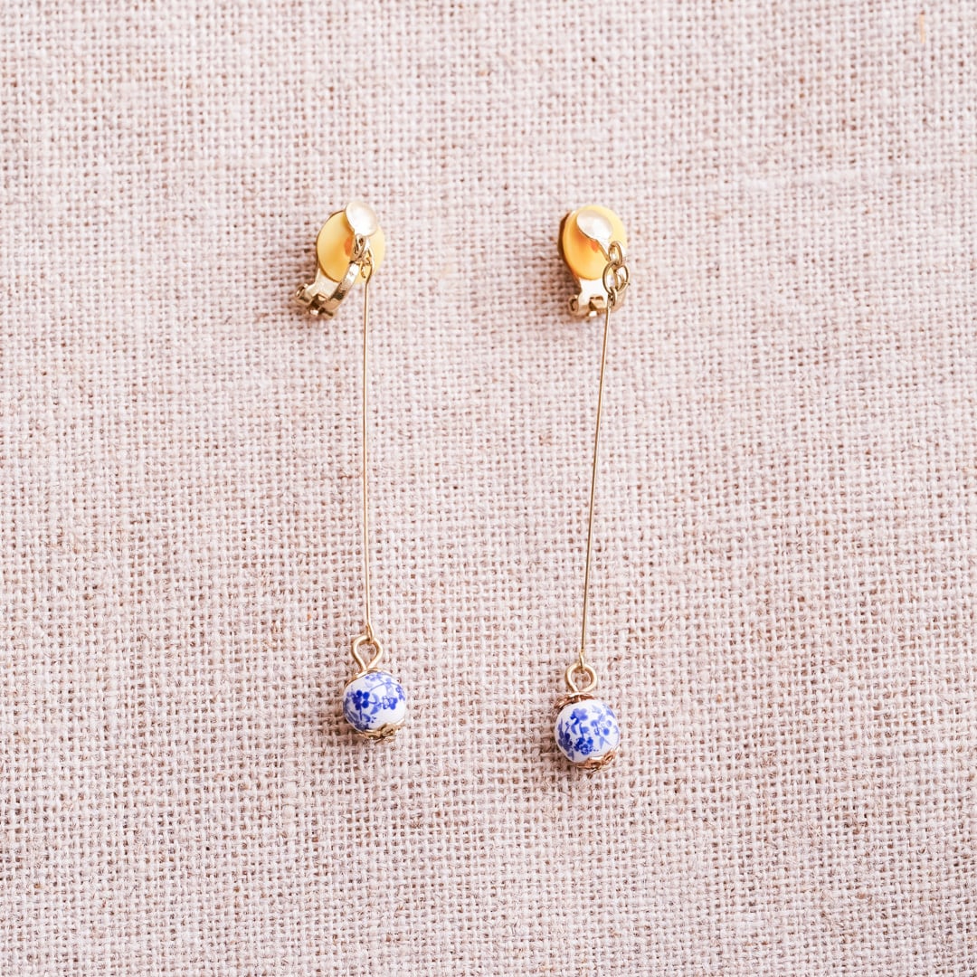 A pair of vintage earrings featuring tiny hand-painted ceramic baubles, each delicately adorned with floral motifs in a soft blue palette. Set against a milky white ceramic base, the hand-painted flowers evoke a subtle Japonisme-inspired aesthetic, where restraint, balance, and quiet beauty are key.
