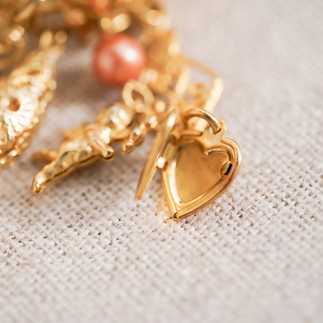 そこから連なるチェーンや小さなモチーフ、雫のように揺れるピンクトーンのパールが、動きに合わせて静かに表情を変えます。