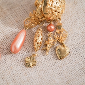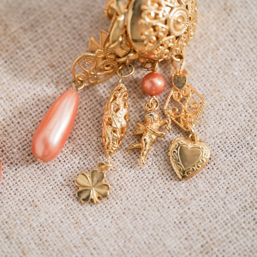 Suspended beneath are chains, small ornamental elements, and softly toned pink pearls that move gently with each motion.