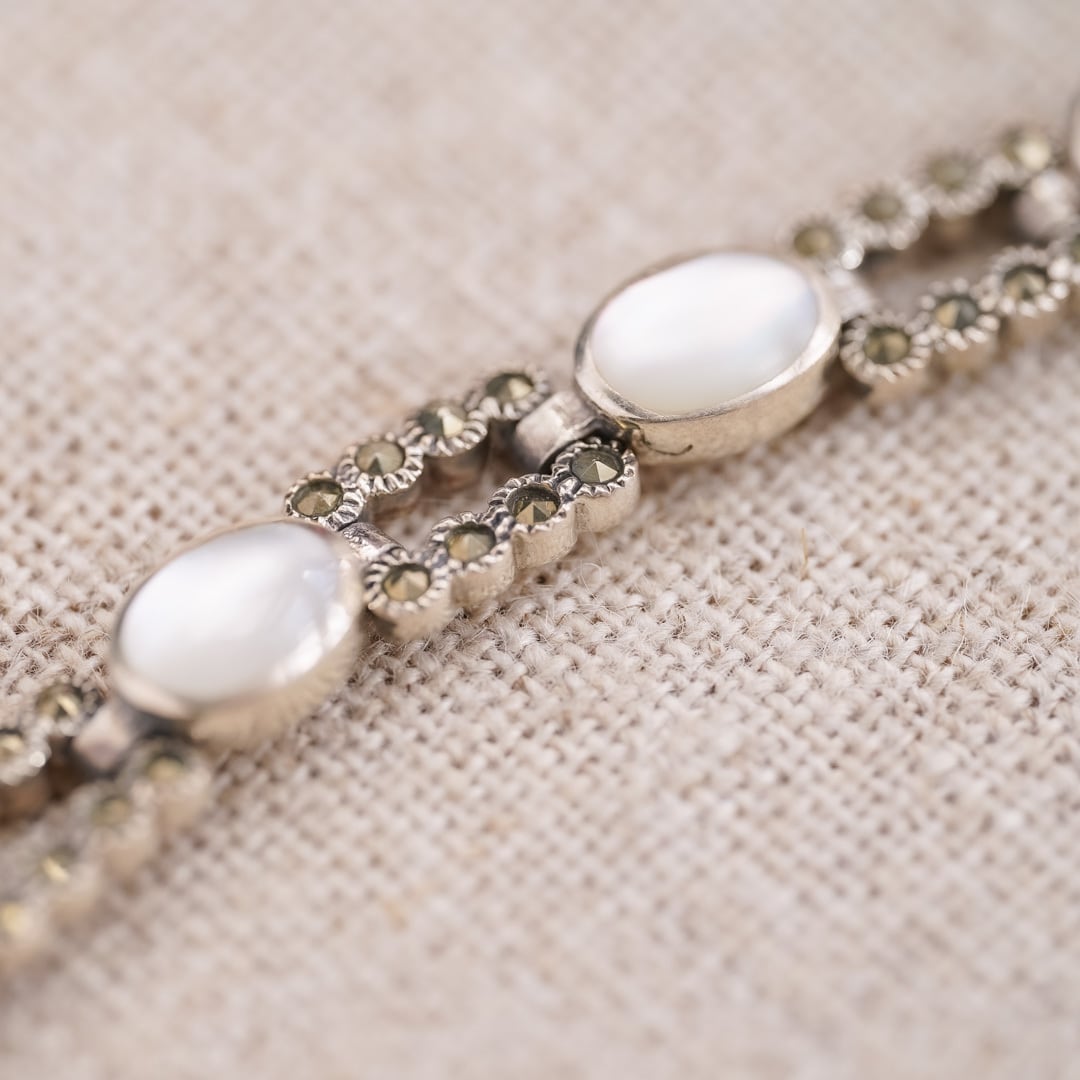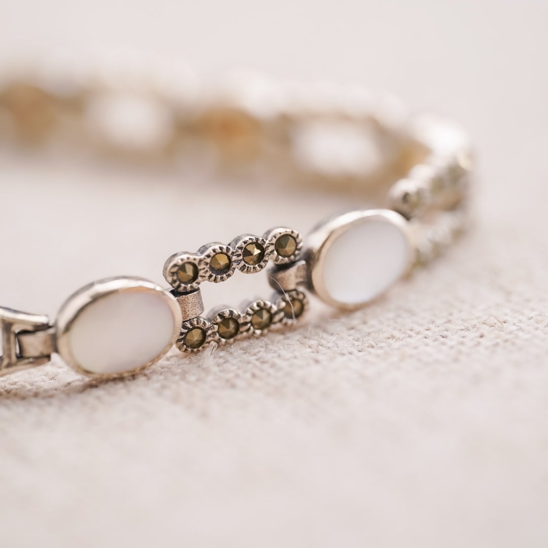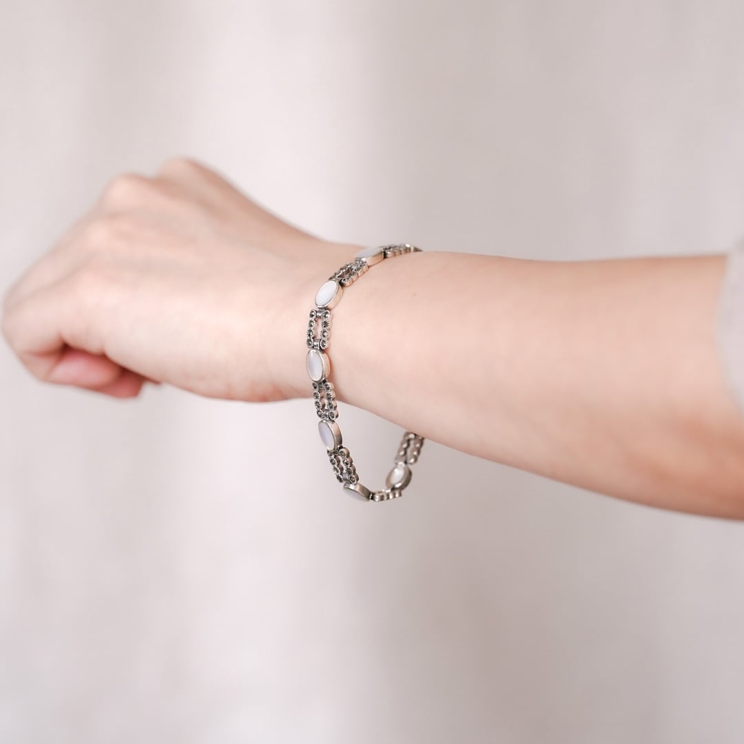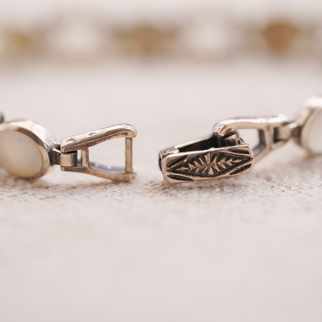 A vintage bracelet composed of sterling silver links, set with softly luminous white oval elements at regular intervals.