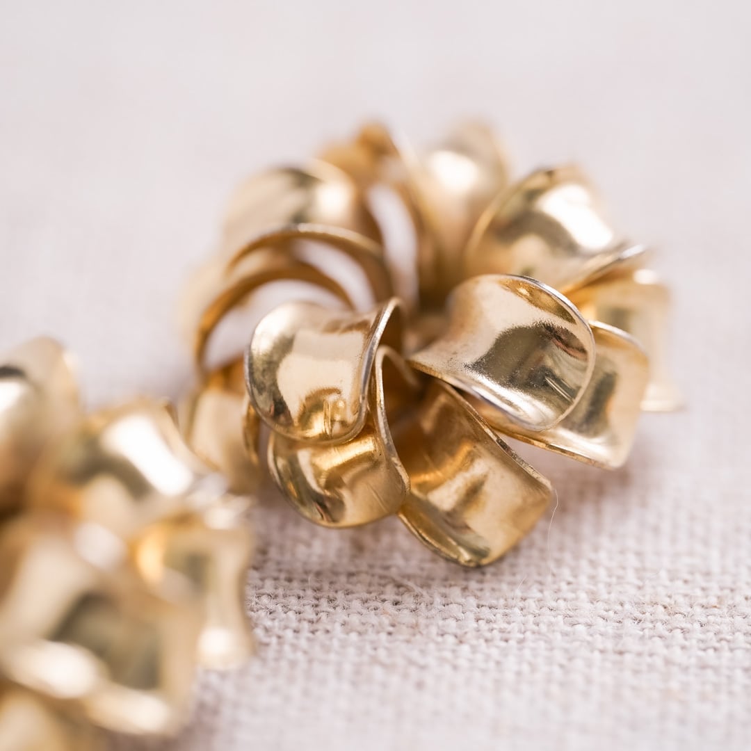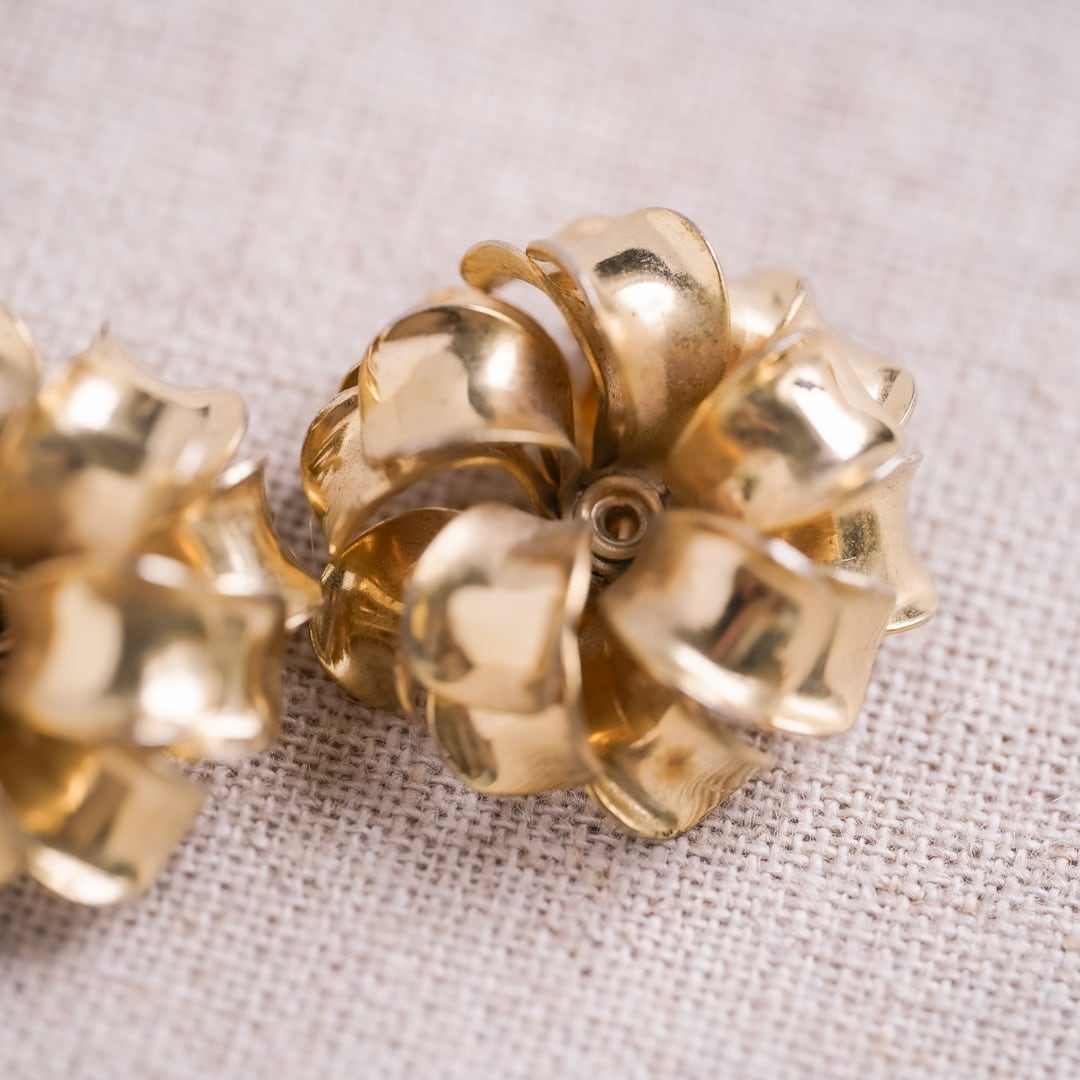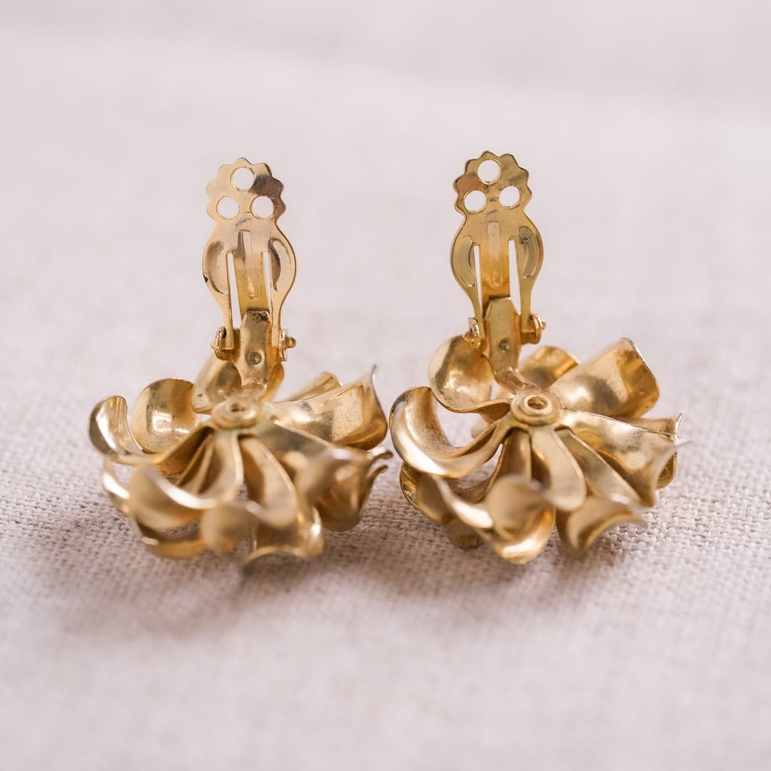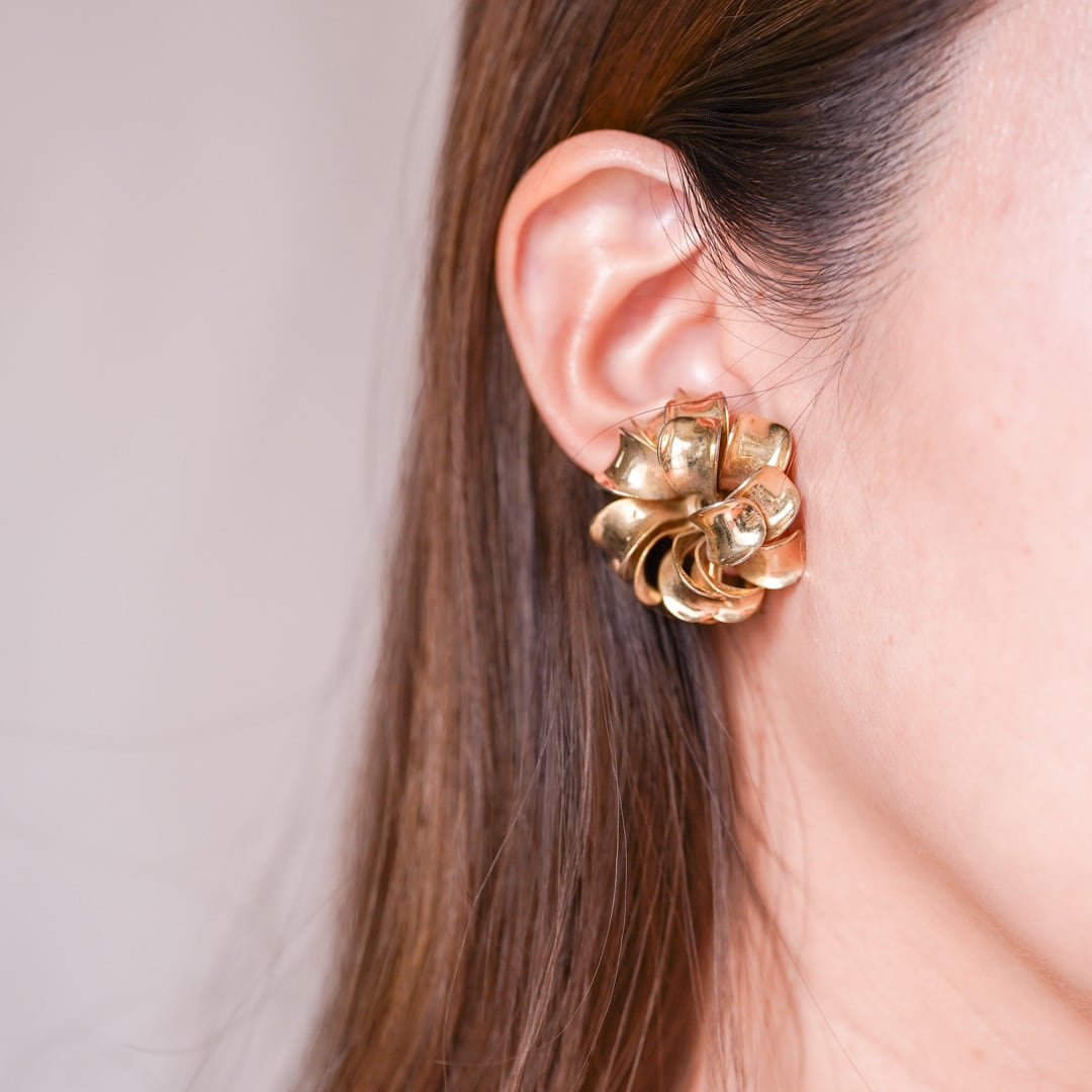 重なり合う花弁のようなフォルムが印象的な、ゴールドトーンのヴィンテージイヤリング。