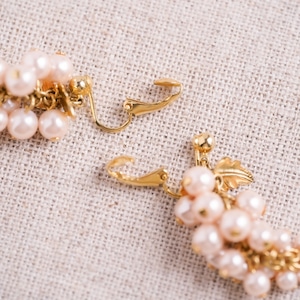 Vintage clip-on earrings featuring a grape motif, with clusters of softly lustrous pearls that move gently with each step.