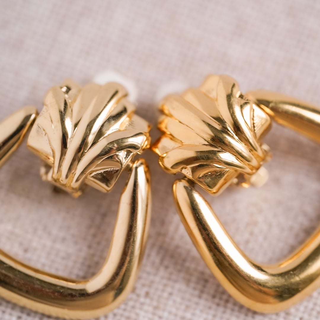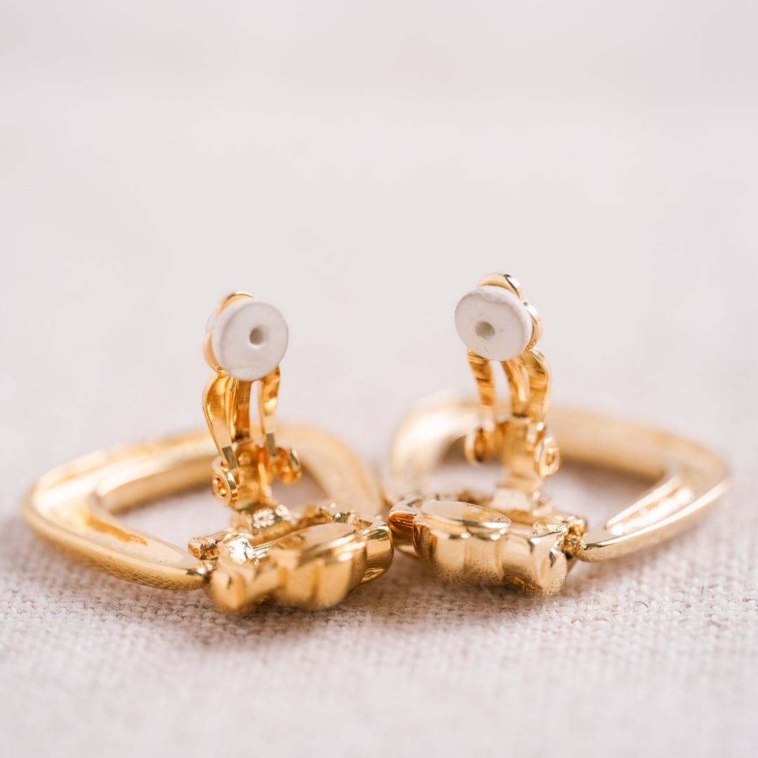 Vintage clip-on earrings featuring softly curved gold-tone hoops accented with a classical leaf motif.