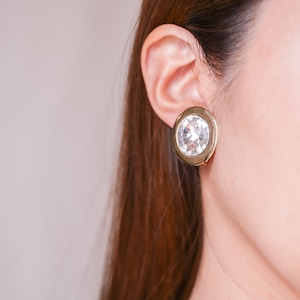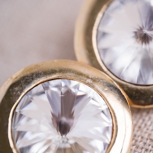 Vintage clip-on earrings featuring a clear faceted cabochon set within a substantial gold-tone bezel.