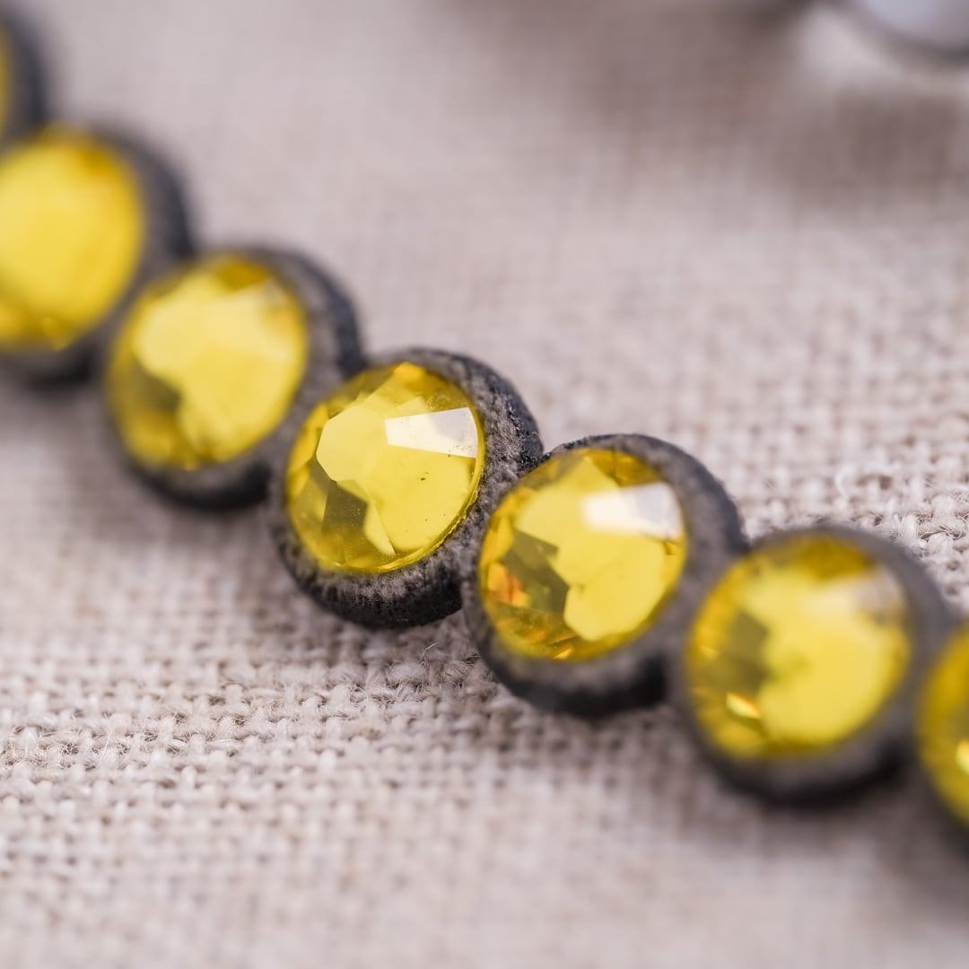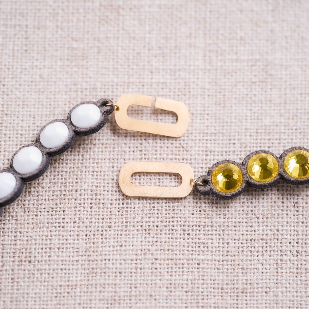 The white elements are finished in enamel, while the yellow sections feature translucent glass stones.