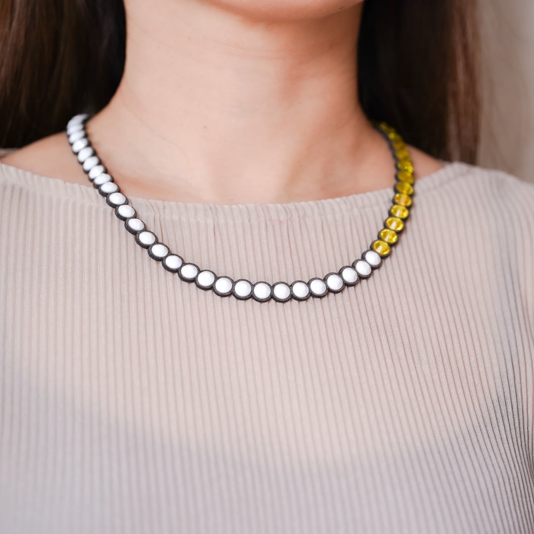 A vintage necklace that brings together two contrasting tones—white and yellow—into a single, balanced line.