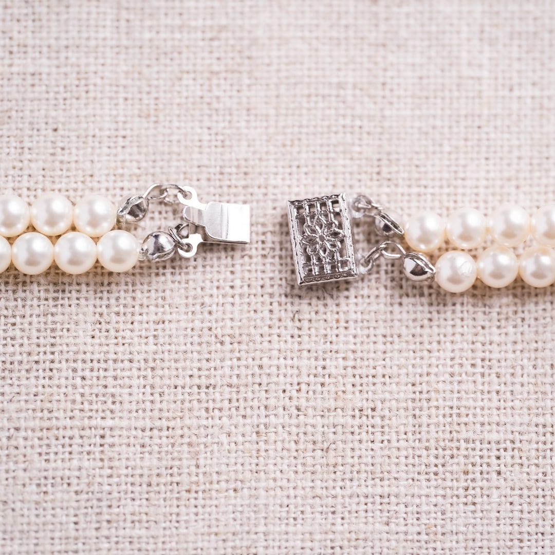 Smooth, lustrous costume pearls are arranged in a double strand,