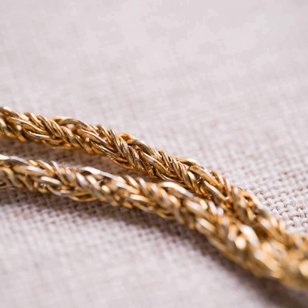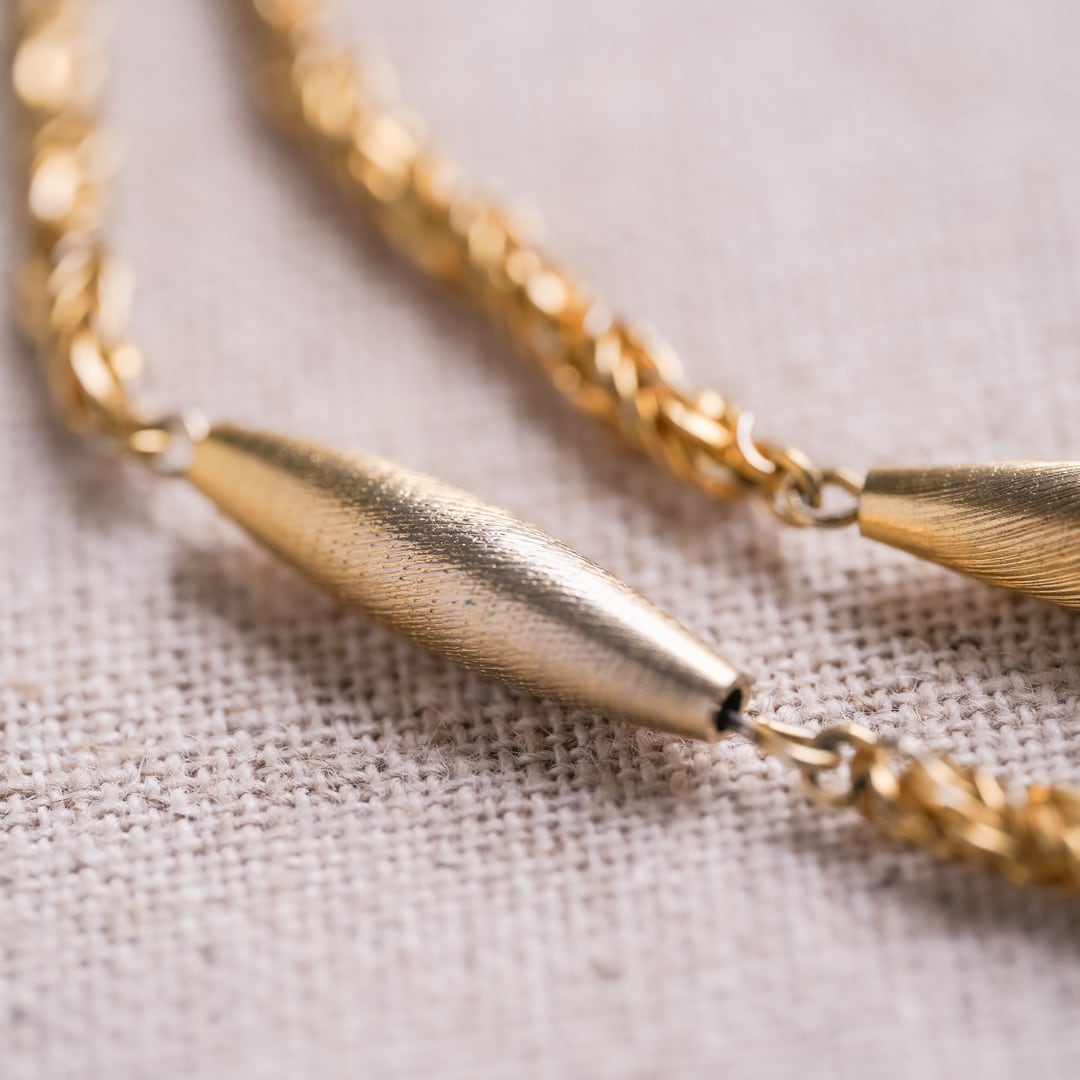 A refined rope chain accented with softly curved metal elements.