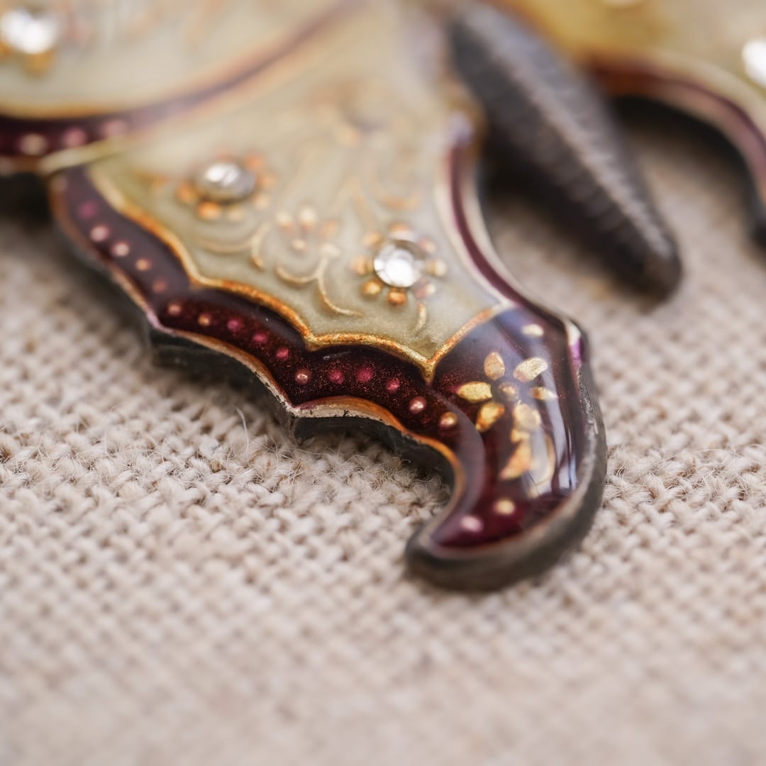 Material: Brass, bronze metal plating, enamel, rhinestone