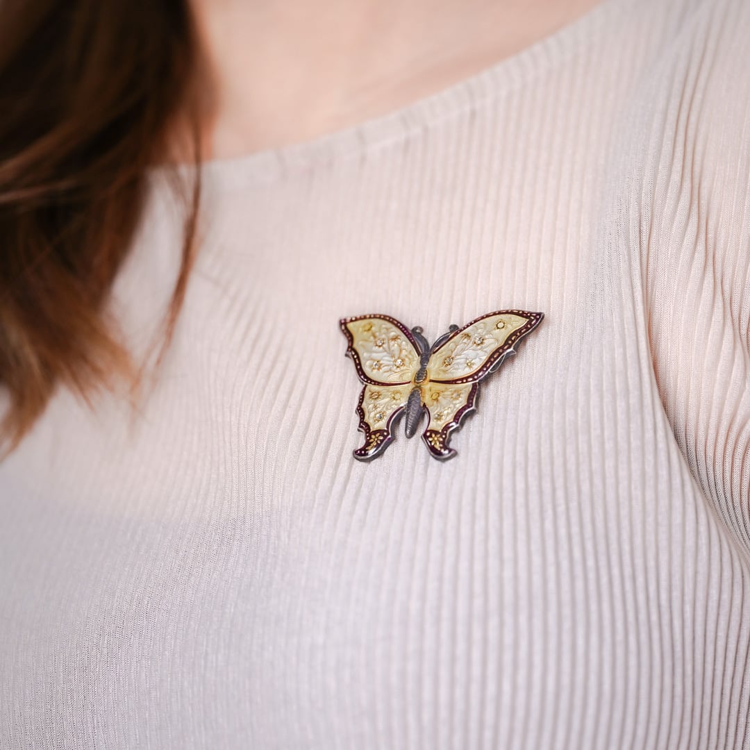 A softly toned yellow butterfly, delicately outlined in fine metal.