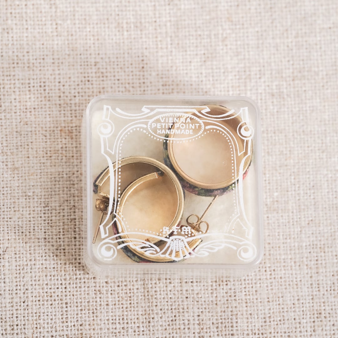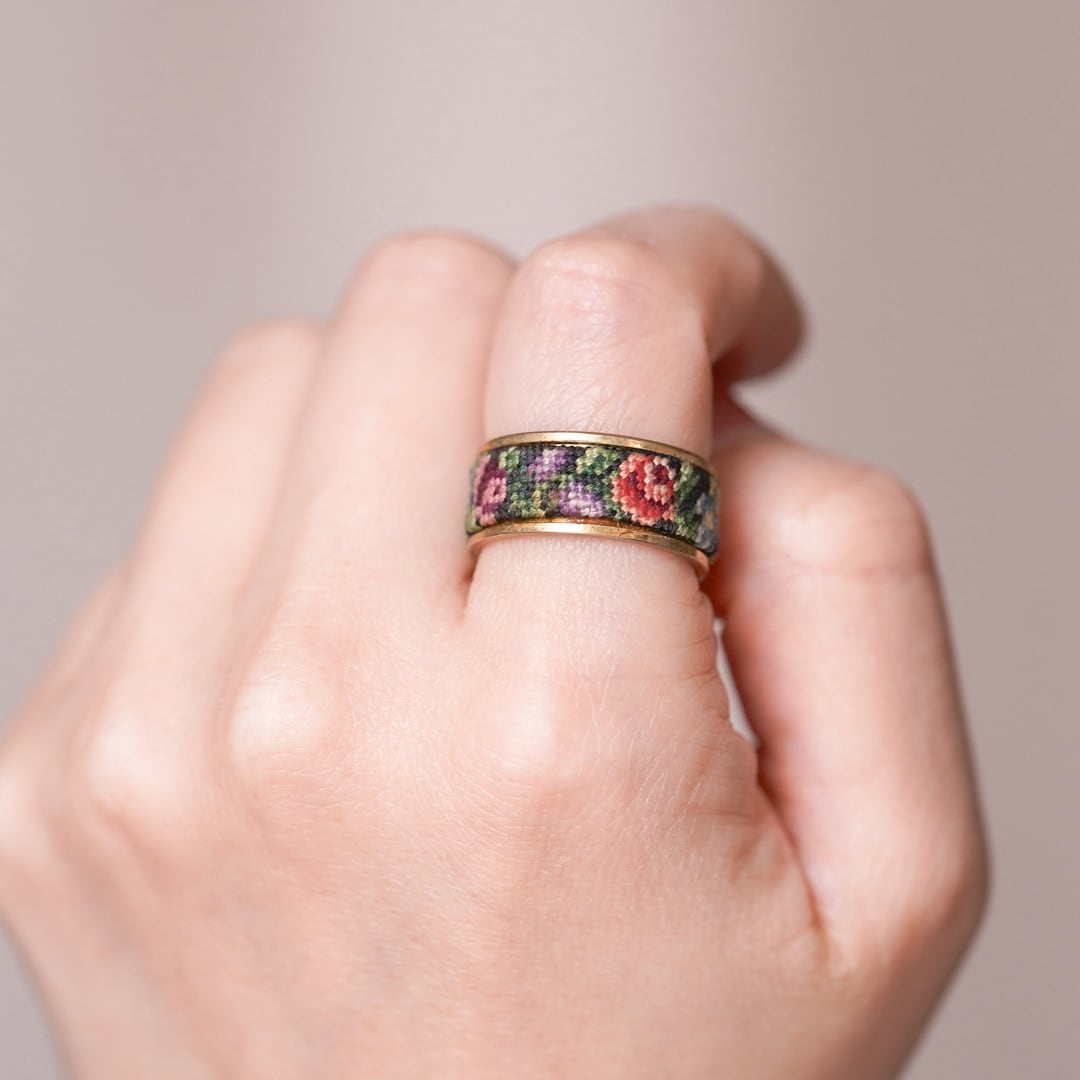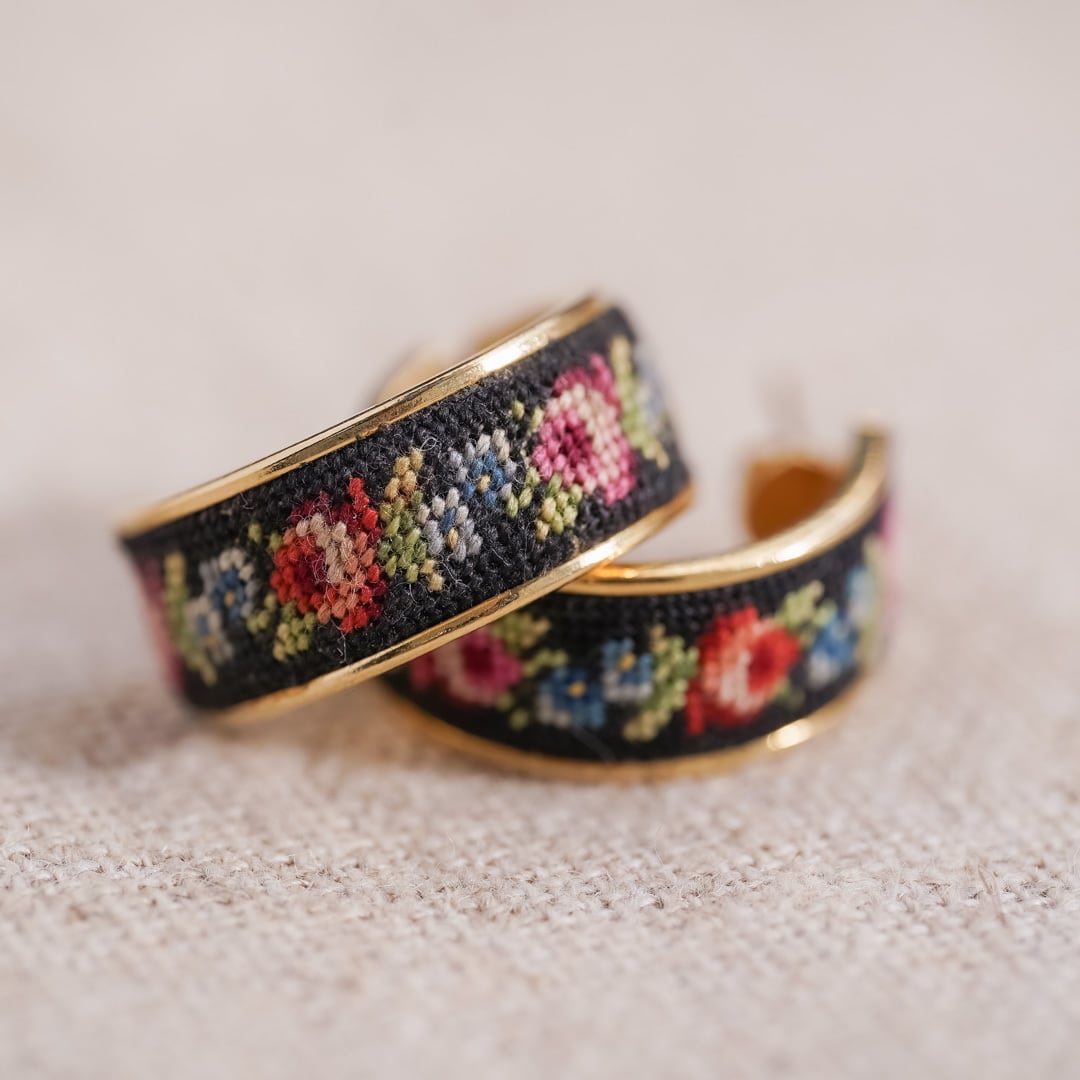 This vintage ring and hoop earrings set features the traditional Austrian Petit Point embroidery technique.