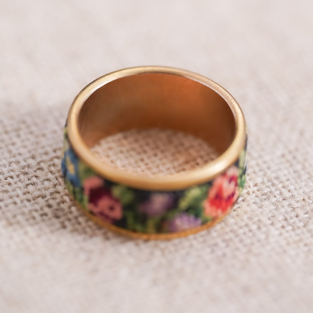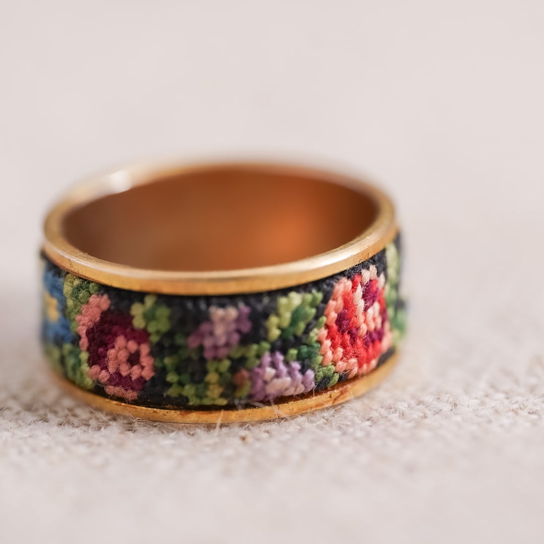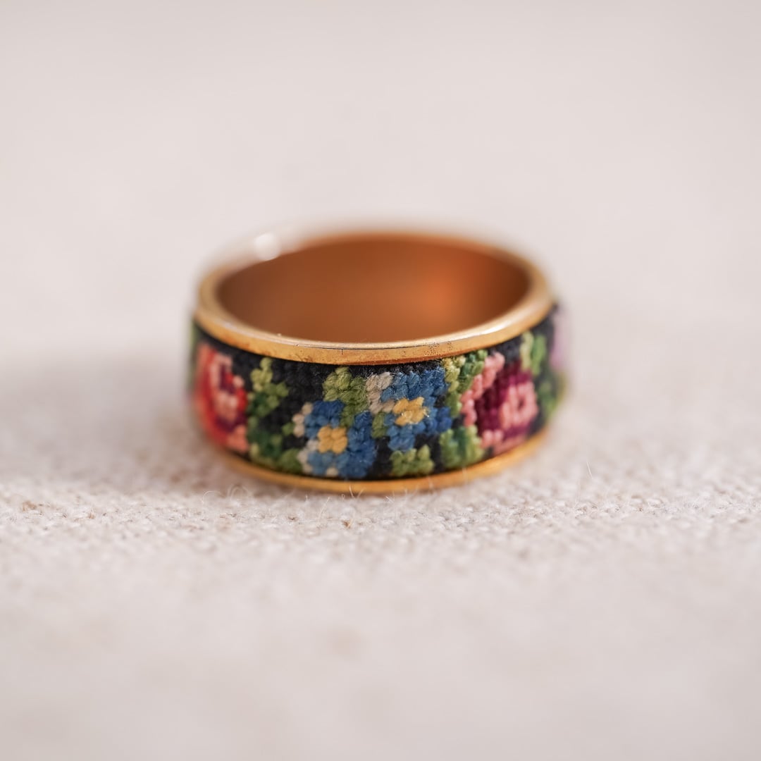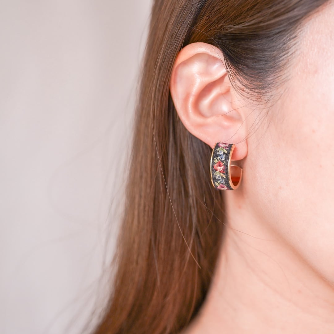 This vintage ring and hoop earrings set features the traditional Austrian Petit Point embroidery technique.