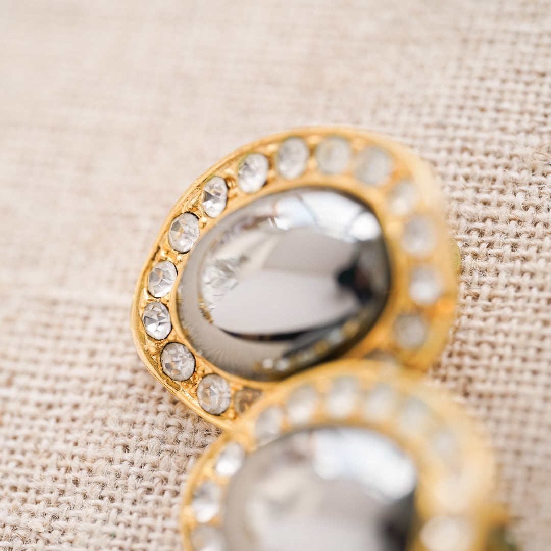 中央には艶を帯びたダークトーンのストーンを配し、その周囲を小粒のラインストーンが囲む構造。やわらかく波打つフレームのフォルムが、全体にモードな空気を添えながらも、どこかクラシカルな均整を保っています。