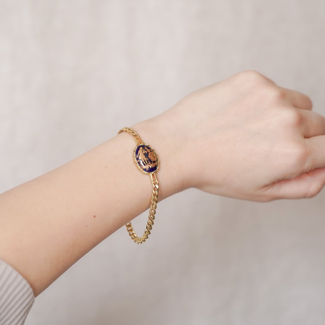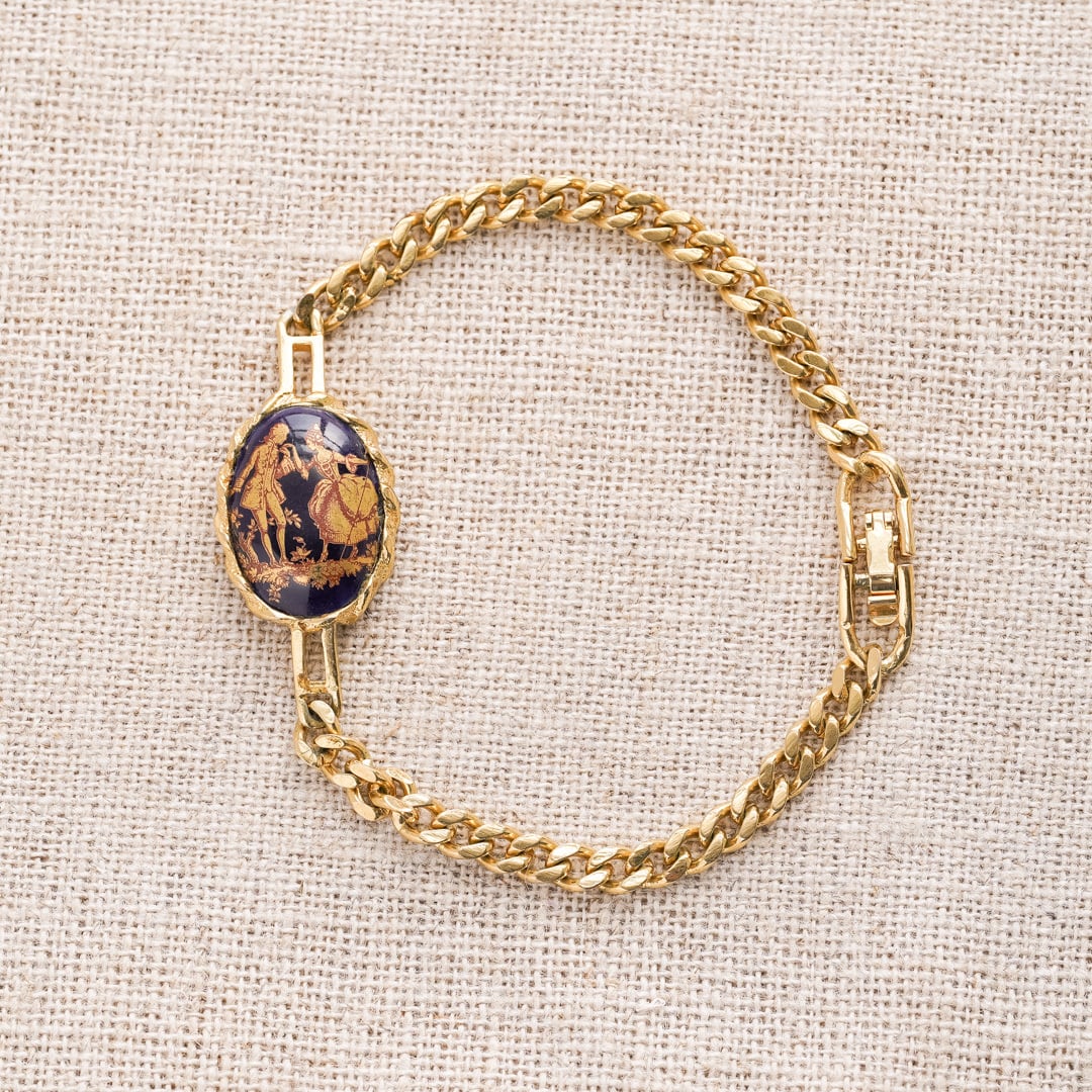 A vintage bracelet centered with an oval Limoges porcelain plaque. Set against a deep navy background, delicate gold detailing forms a classical motif, holding a quiet narrative within a small surface.