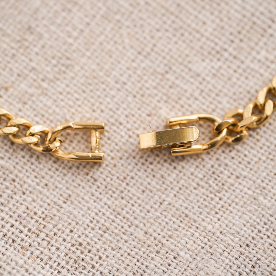 本品は、ポーセリンパーツをゴールドトーンのフレームで包み、クラシックなチェーンと組み合わせた構造。チェーンは適度な厚みがあり、手もとにのせたとき軽すぎない安定感があります。金属部分には経年によるやわらかな艶が生まれ、過度な光沢ではなく落ち着いた表情です。