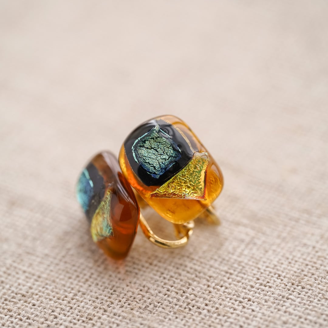 This is more than simply “glass jewellery.” The composition, colour balance, and placement of the gold leaf reflect thoughtful craftsmanship. Though modest in size, the earrings introduce a composed tension to an outfit, refining the overall silhouette rather than overwhelming it.