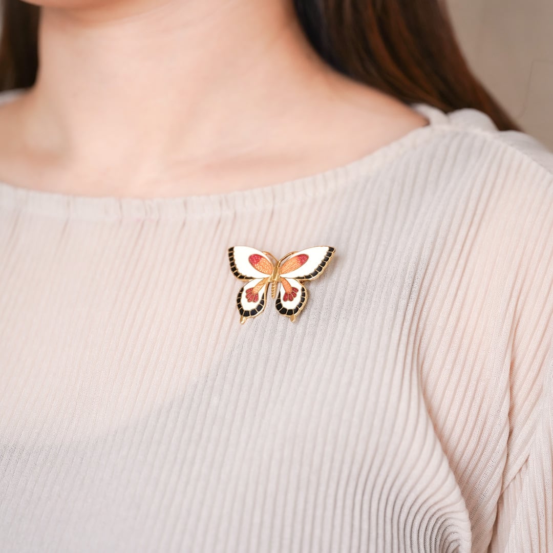 This butterfly motif is rendered in soft ivory enamel, layered with shades of pink, apricot, and deep navy. The symmetrical wings are carefully structured, yet the gentle colour transitions evoke a sense of natural movement and warmth.