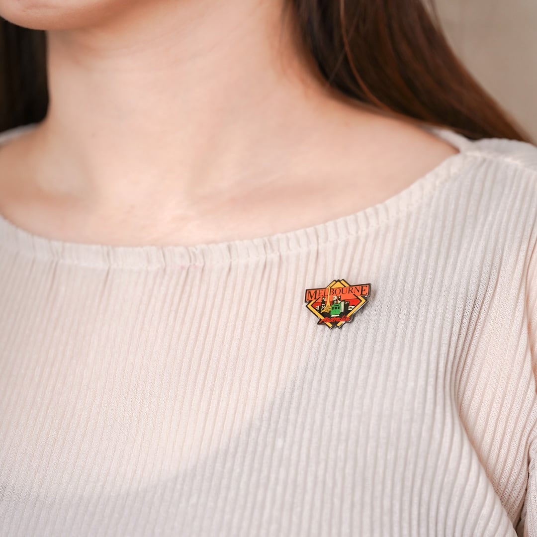 A vintage brooch featuring the name “Melbourne” set against a stylised city silhouette.