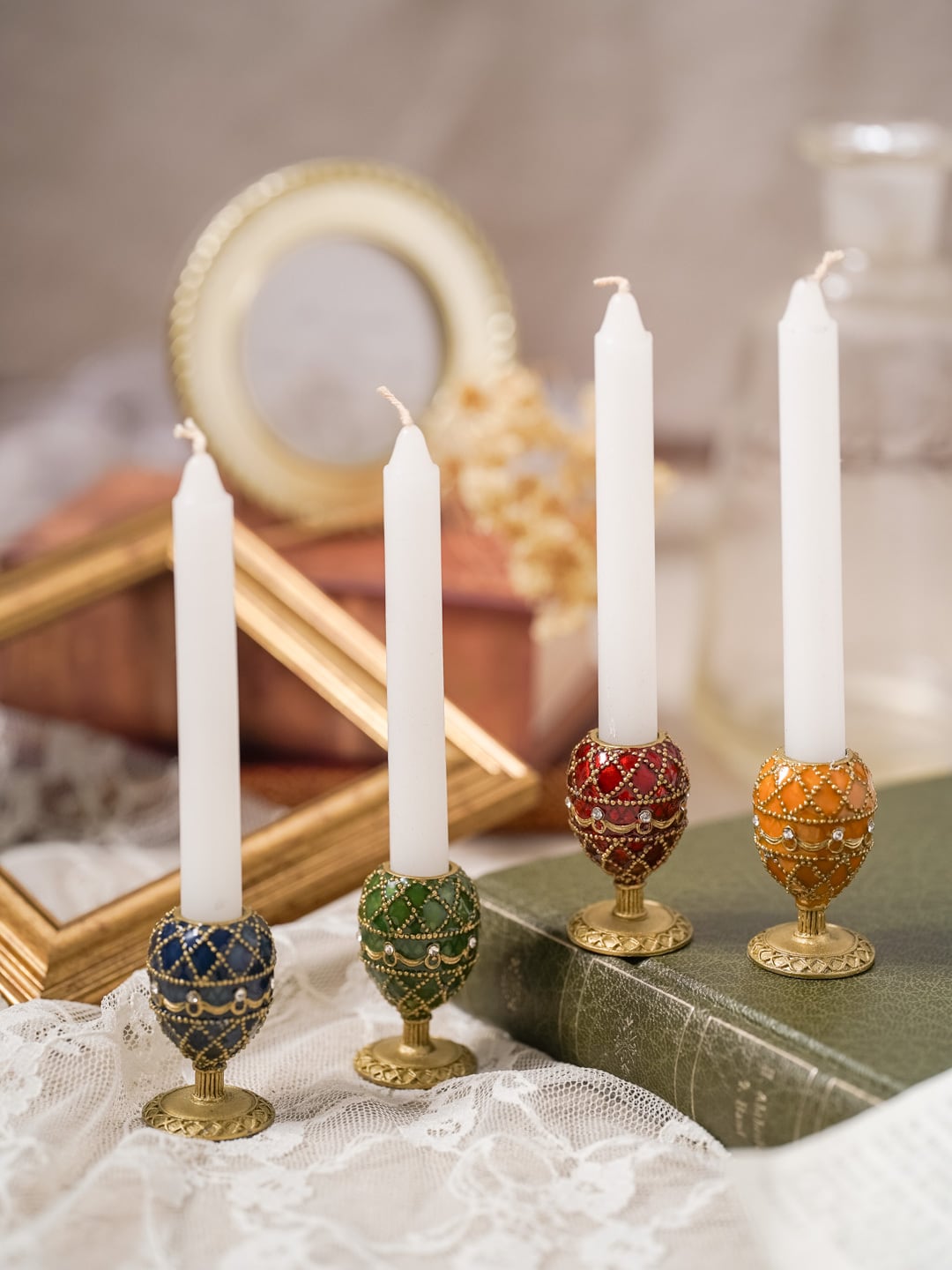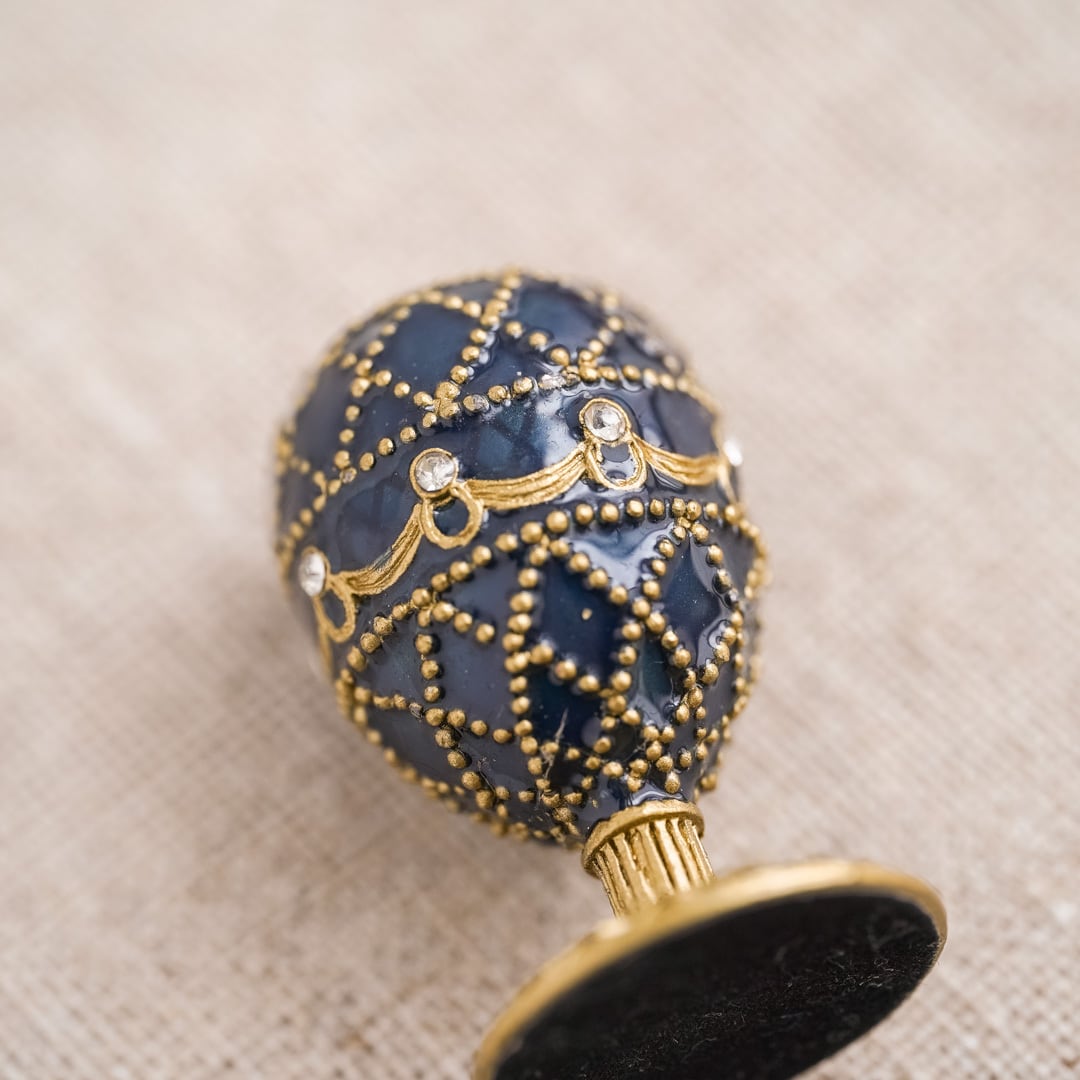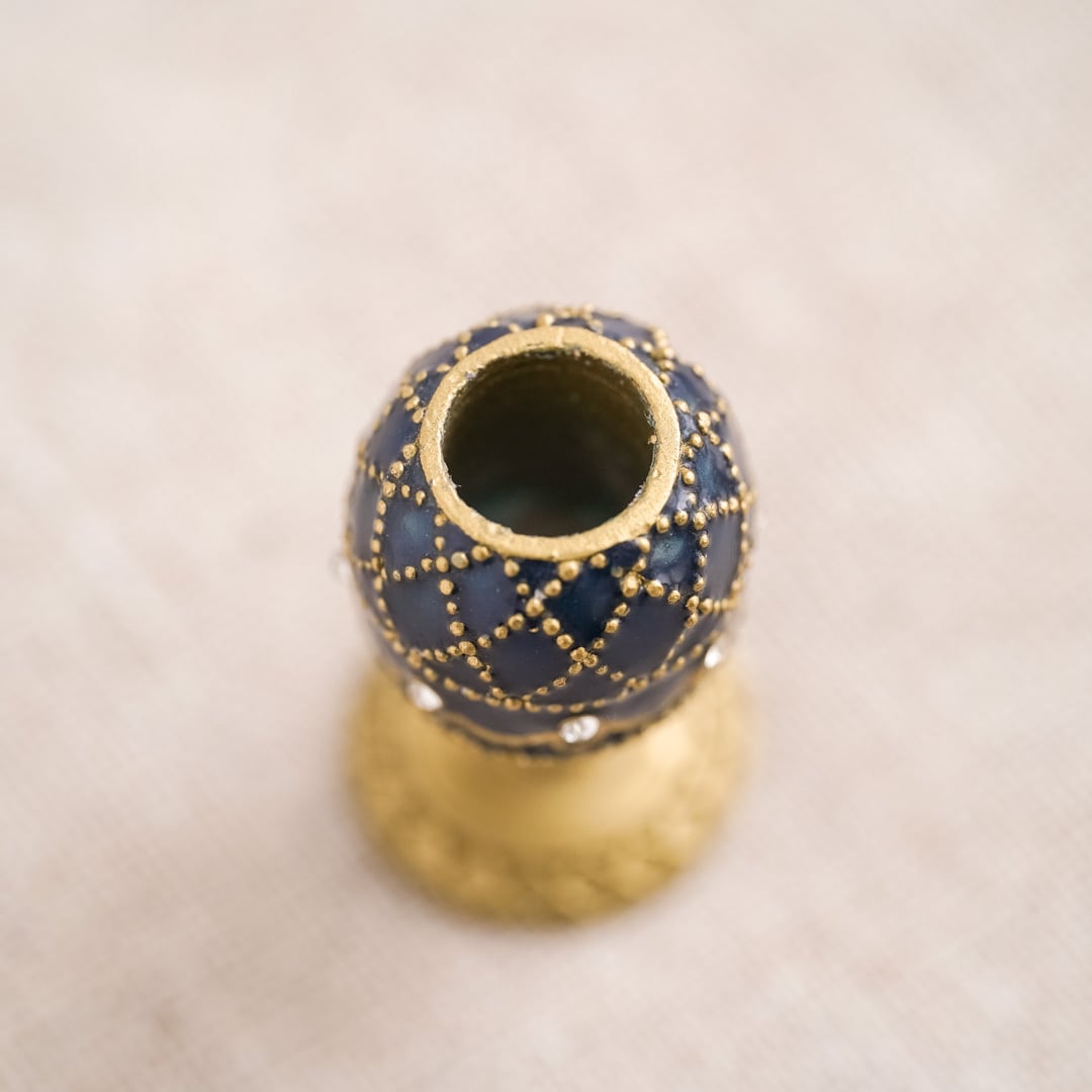 Drawing from the egg form and metal lattice ornamentation seen in Fabergé’s jeweled designs,