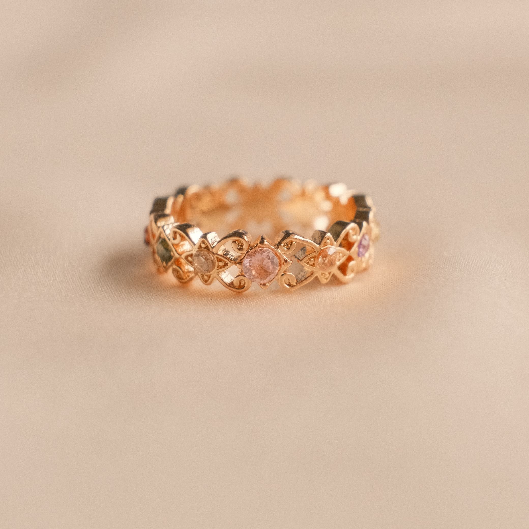 Like an amulet that protects you and promotes happiness and wellbeing, we created this ring with the hope that it will help you to achieve wellness and contentment. Studded with beautiful colors, and employing a classic vintage lace motif, the Elaine ring will add that little something to your overall outfit.
