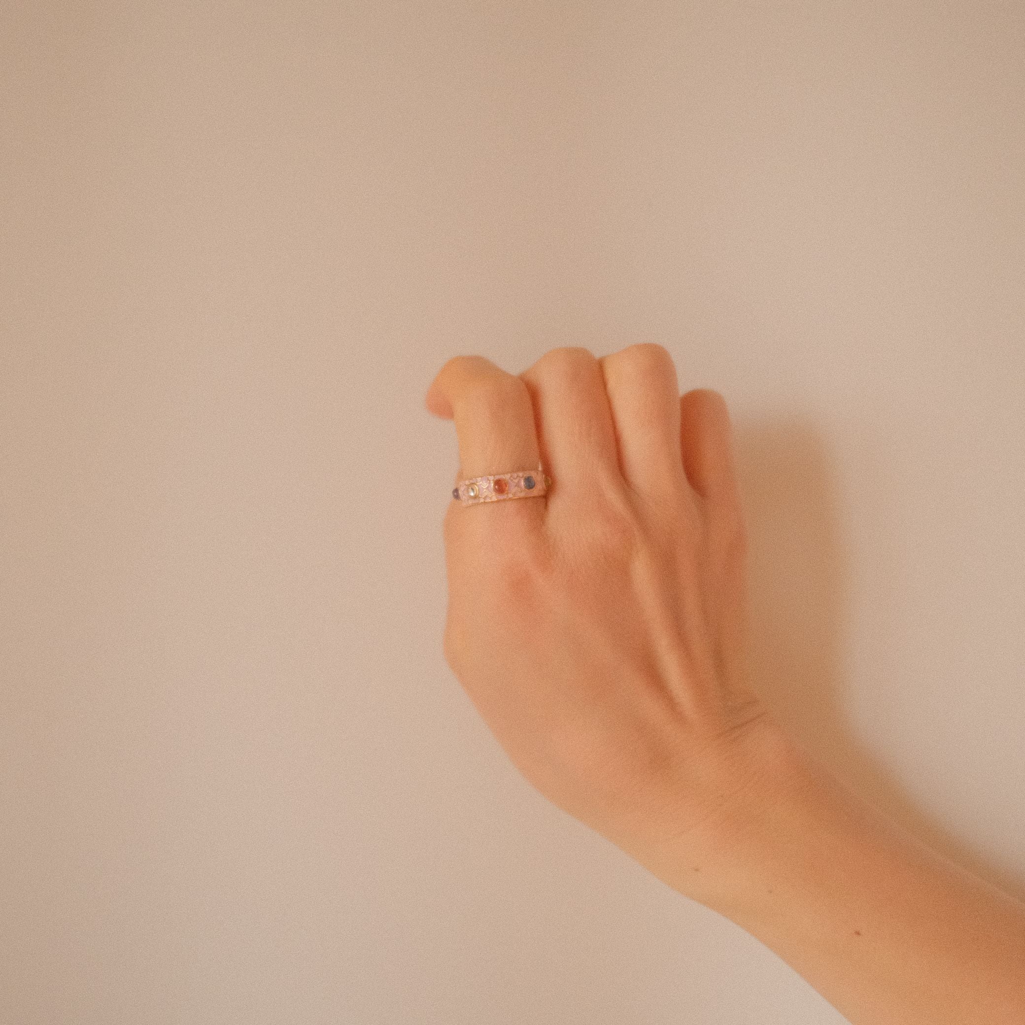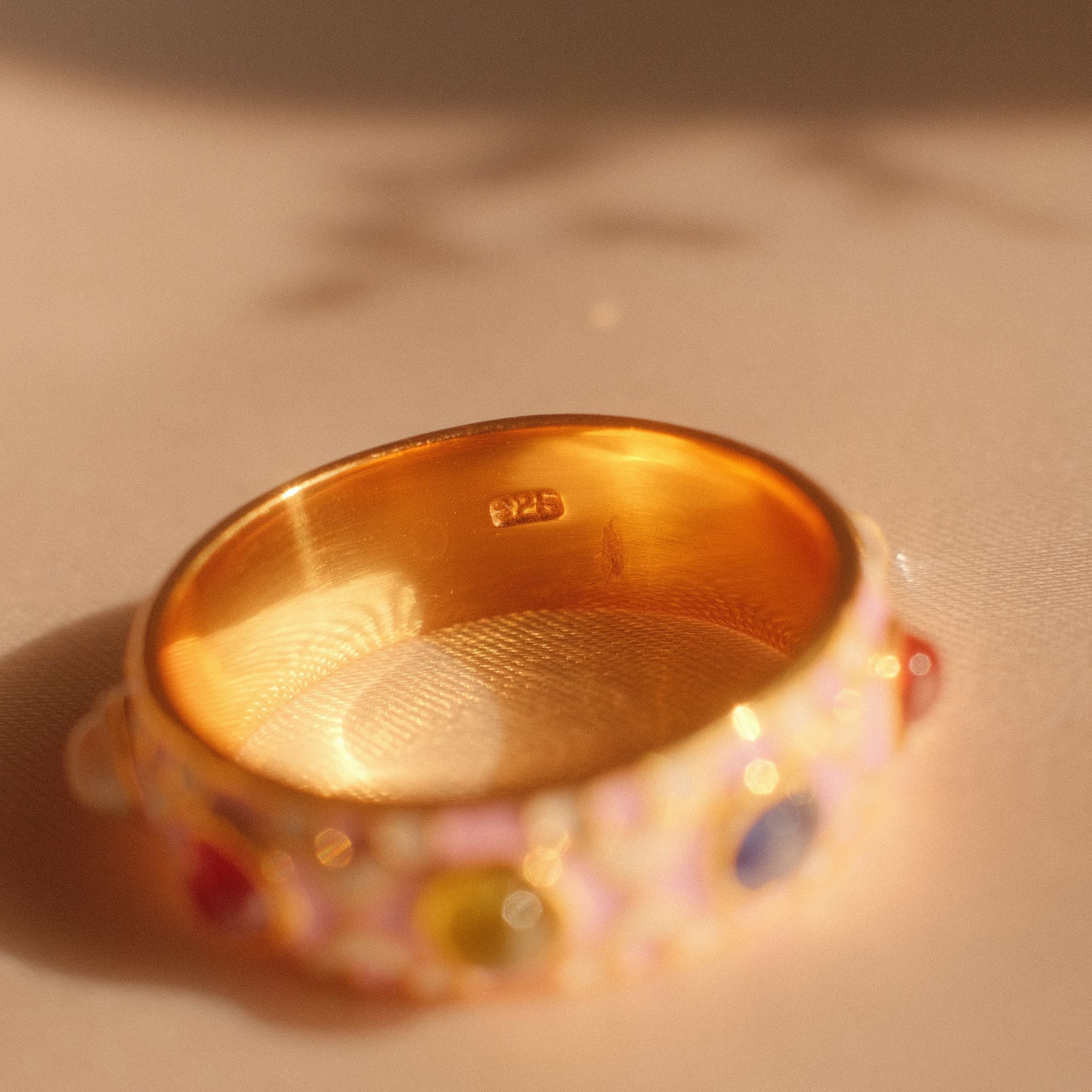 シルバー925をベースに、22KGでプレーティングされた上質のヴィンテージエマイユリング。さりげなく目をひくシノワゼリのエマイユデザイン。優しいトーンとストーンのコントラストが魅力です。ガーネット、アガット、ペリドット、ムーンストーンを含む多種類のストーンを集めた贅沢なアイテムです。
