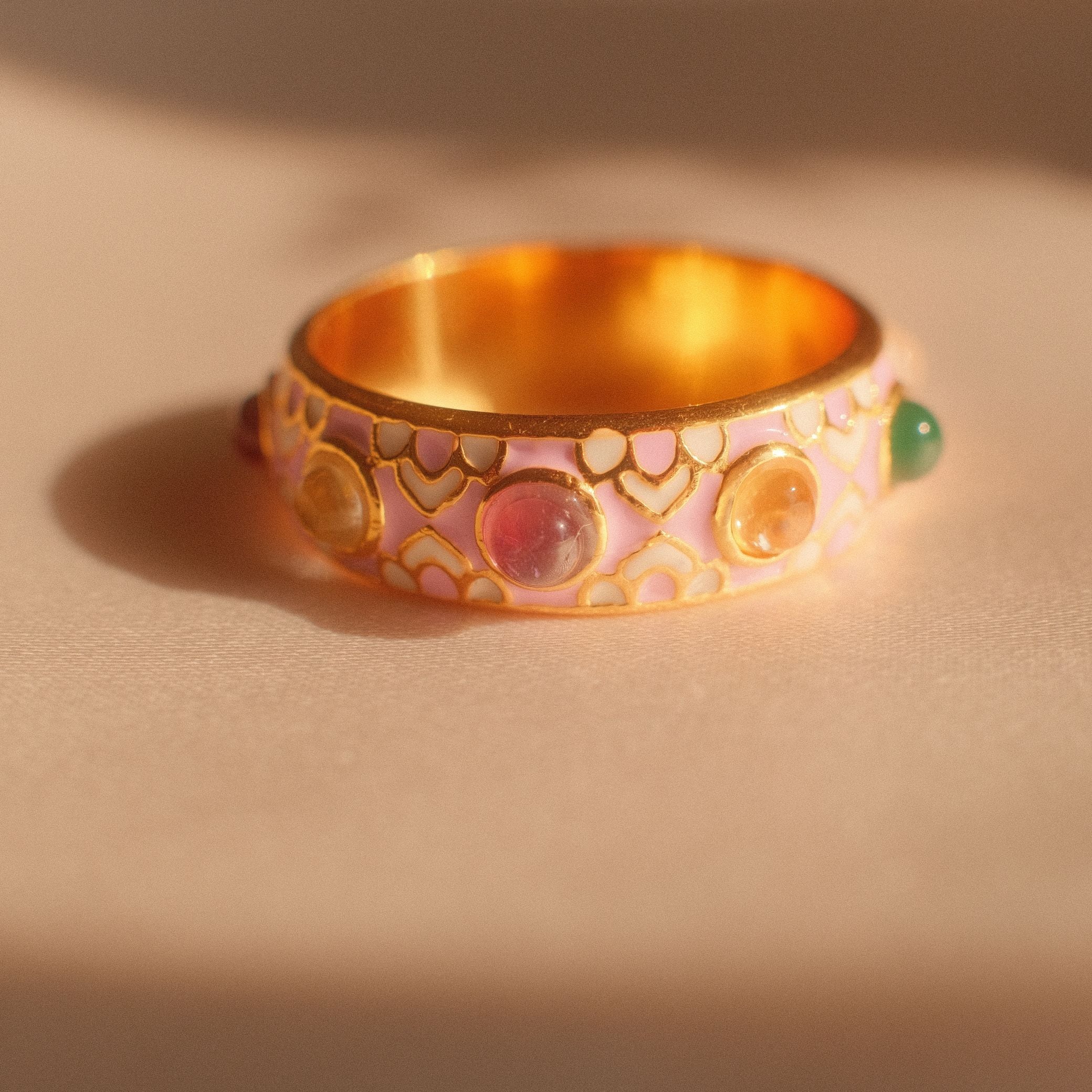 Inspired by crown designs of old Europe, fine enamel detail, use of precious stones and a lush gold finish makes this ring a very special piece. It will add a touch of luxury to your overall outfit, no matter how minimal or understated!