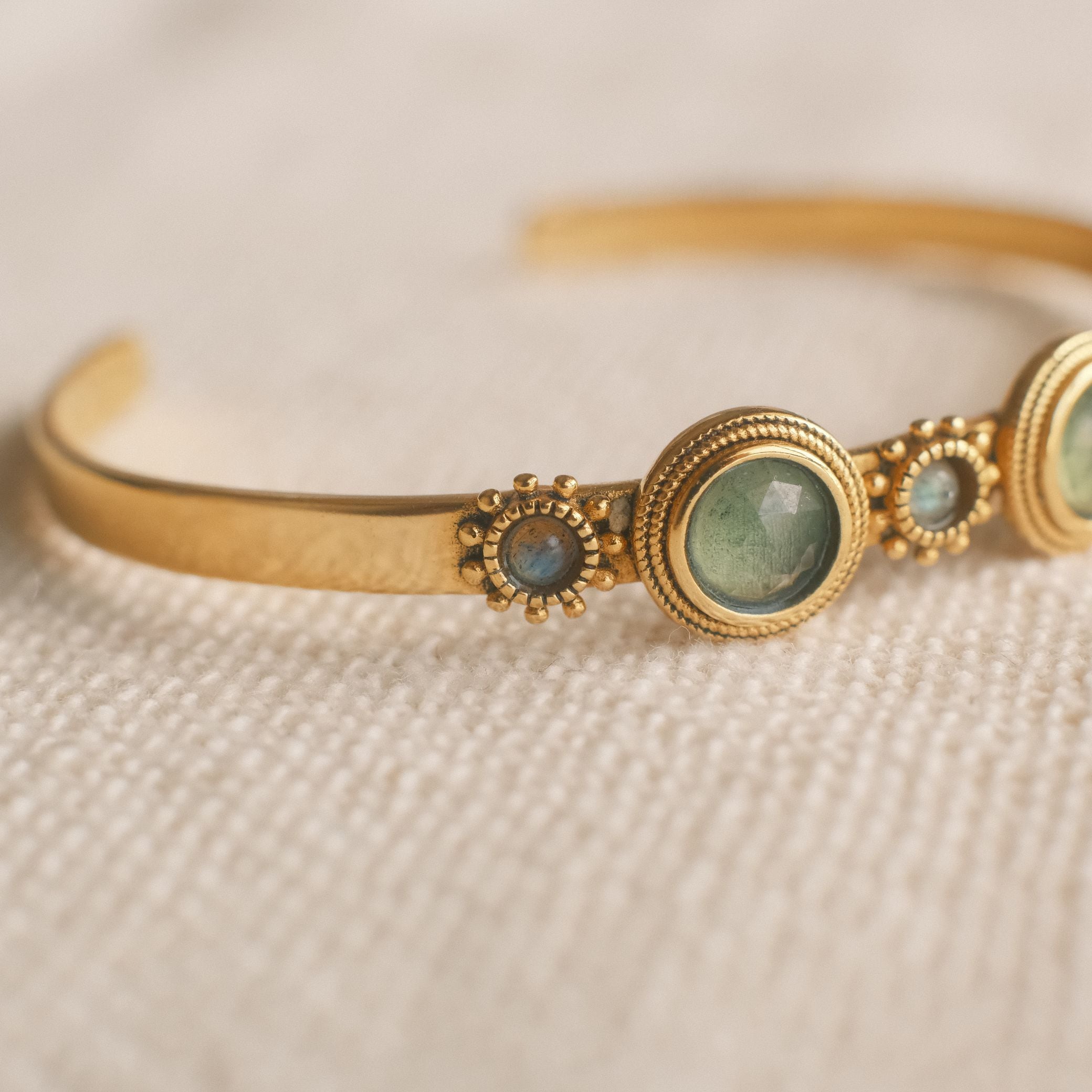 Materials: Brass, 18K gold plated, blue tourmaline, laboradorite