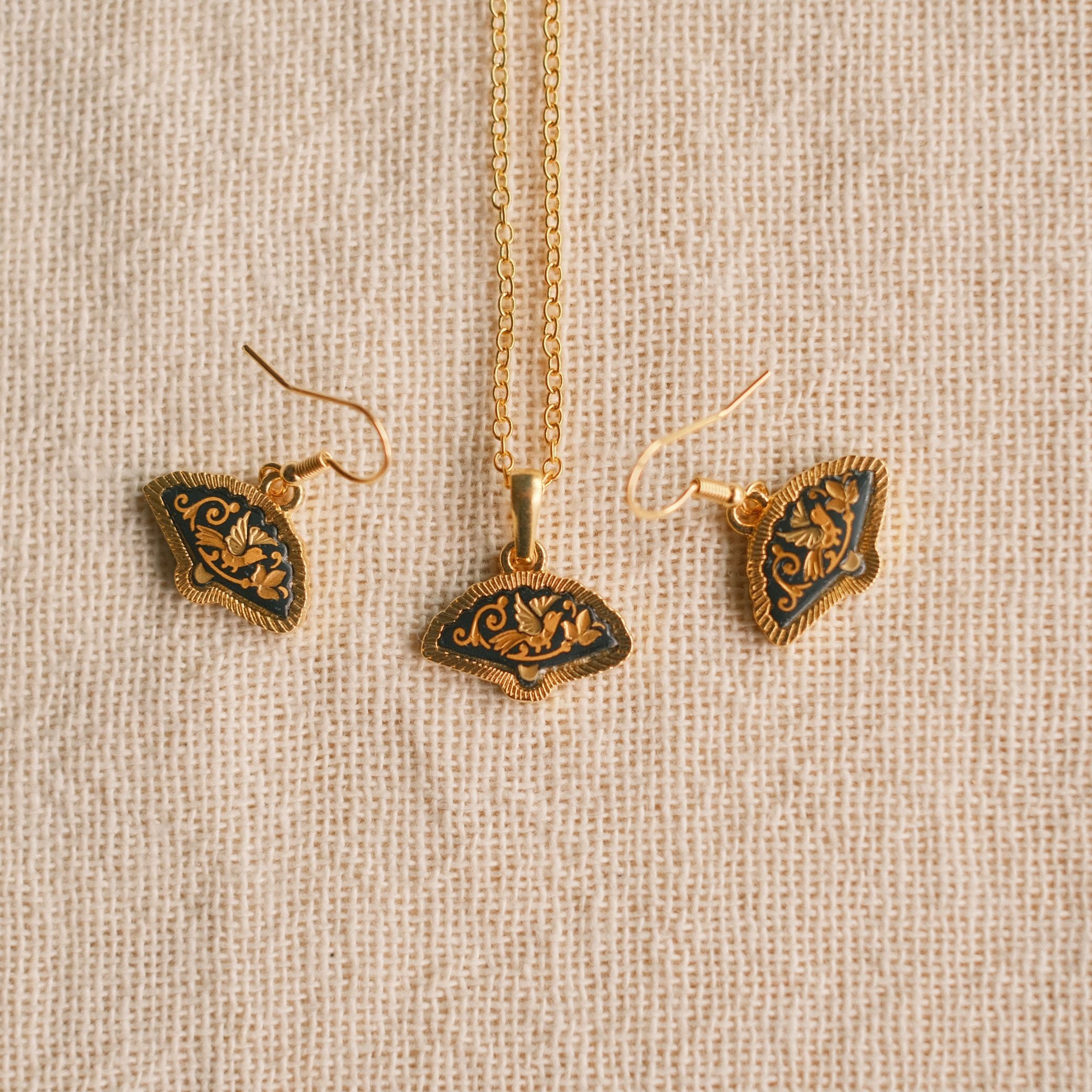 The labor-intensive technique is a surface decoration of engraving and metal plating. The jewelry is often made of steel or other base metal in which precious metals (usually 18 and 24k gold) are placed in groves on a small surface, then hammered in place. The black background is created by the oxidation of a very hot solution used to darken the background, creating magical scenes and stories.