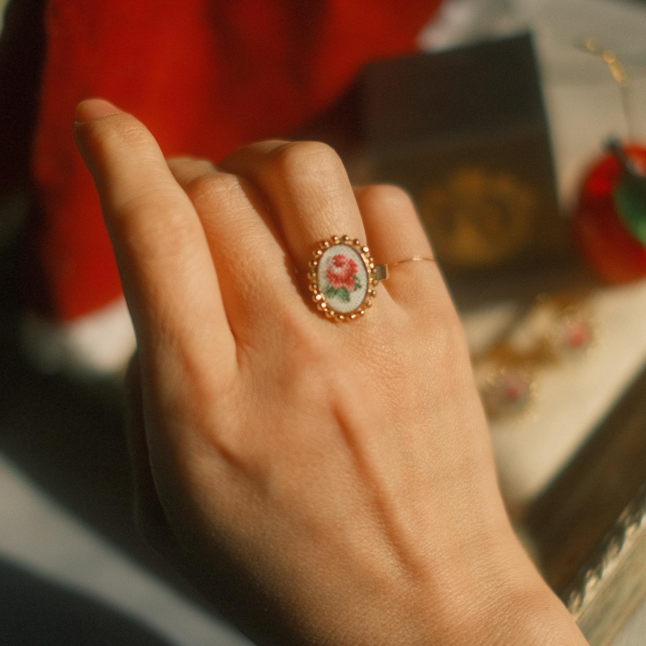 今回はプチポワンリングをご用意いたしました。この繊細な技法で描いたローズを中心としたクラシカルなデザイン。シンプルなフレームとシャンクは上質のシルバー925を使用。ヴィンテージライクな深みのあるゴールド18KGPでコーティングされ、プチポワンの芸術性を一層引き立てます。