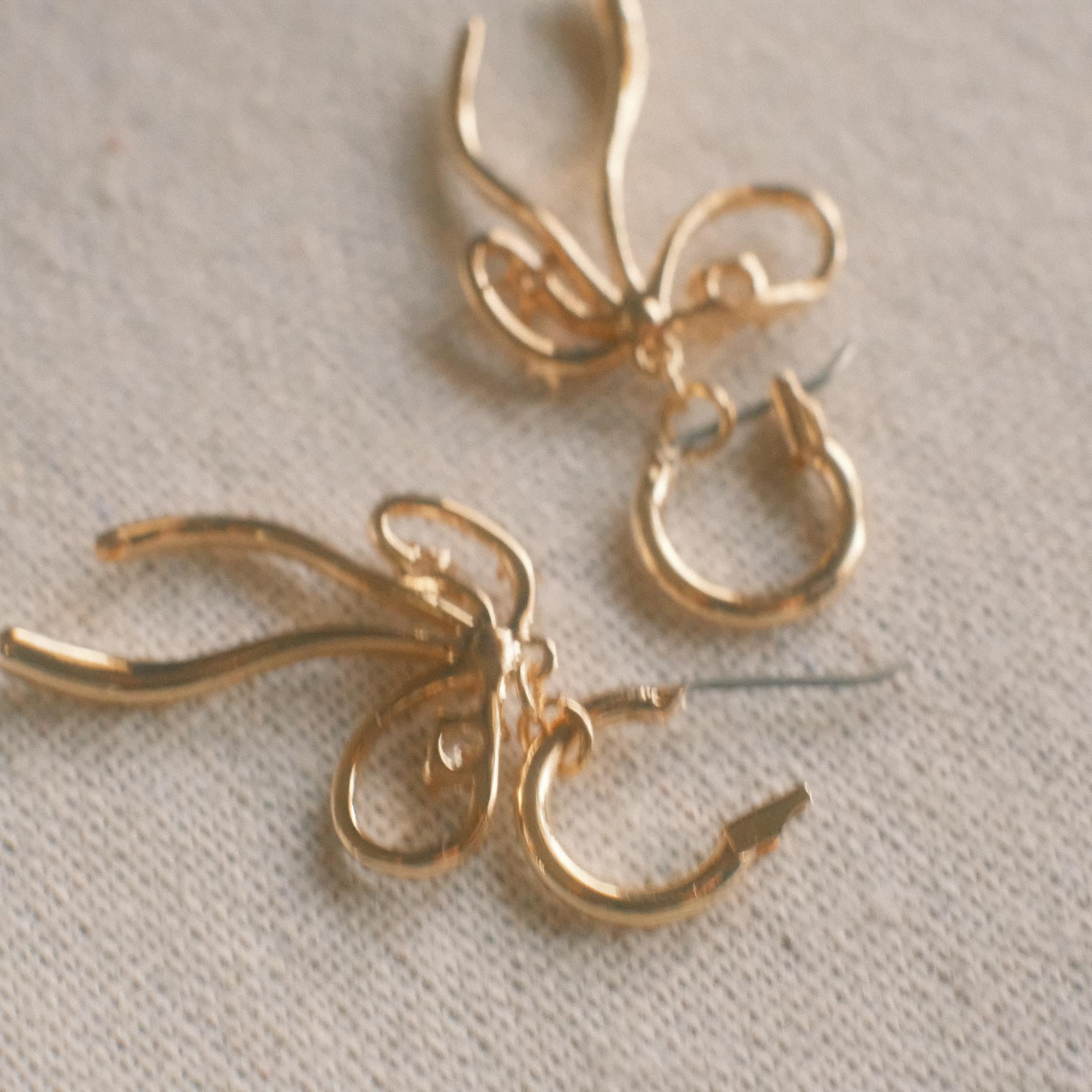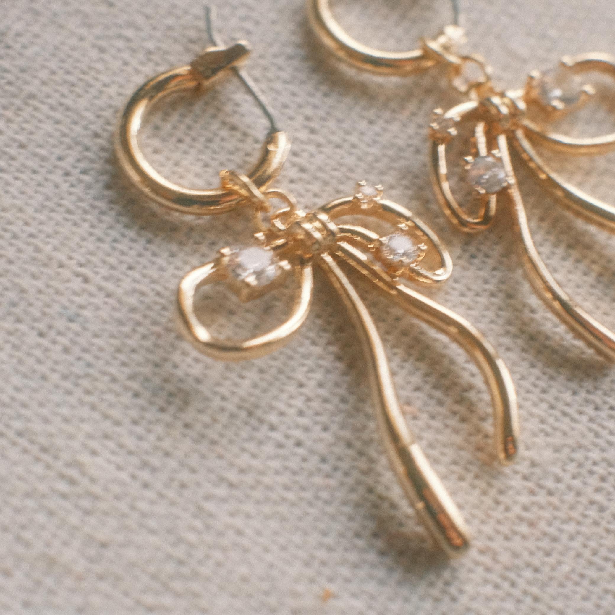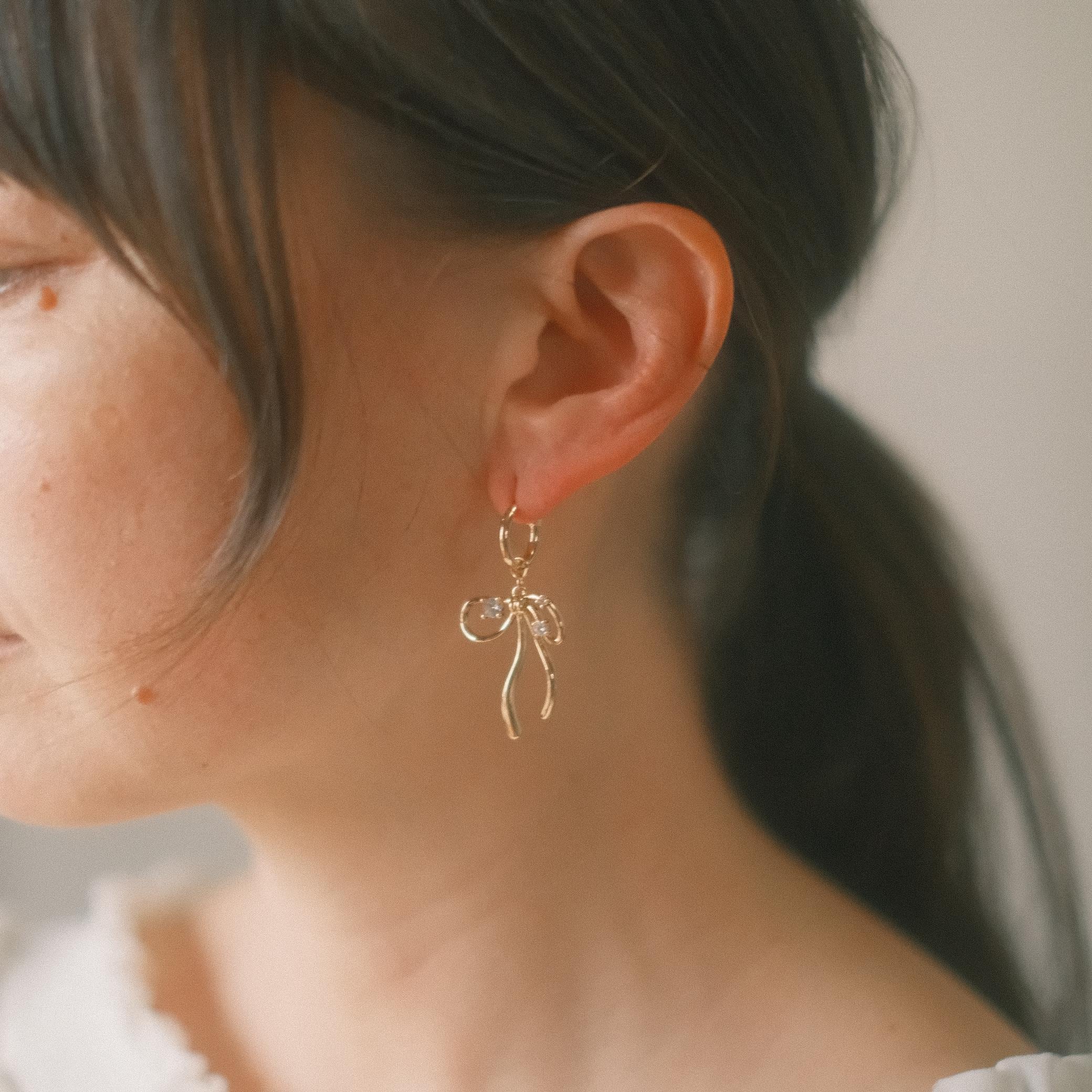 しなやかな曲線とアシンメトリーのシルエットがとびきりかわいい、ヴィンテージボウモチーフピアス。ボウモチーフチャームは取り外し可能なので、シンプルなフープのみのご使用も可能です。アシンメトリーデザインがエレガントなシルエットをつくりだし、しなやかな曲線が気品を後押しします。近年再度リバイバルを見せているボウモチーフアクセサリーですが、こちらは元祖のリボンモチーフピアス。ヴィンテージゴールドとラインストーンのやさしいきらめきが顔まわりを明るくしてくれ、コーデにニュアンスがうまれます。