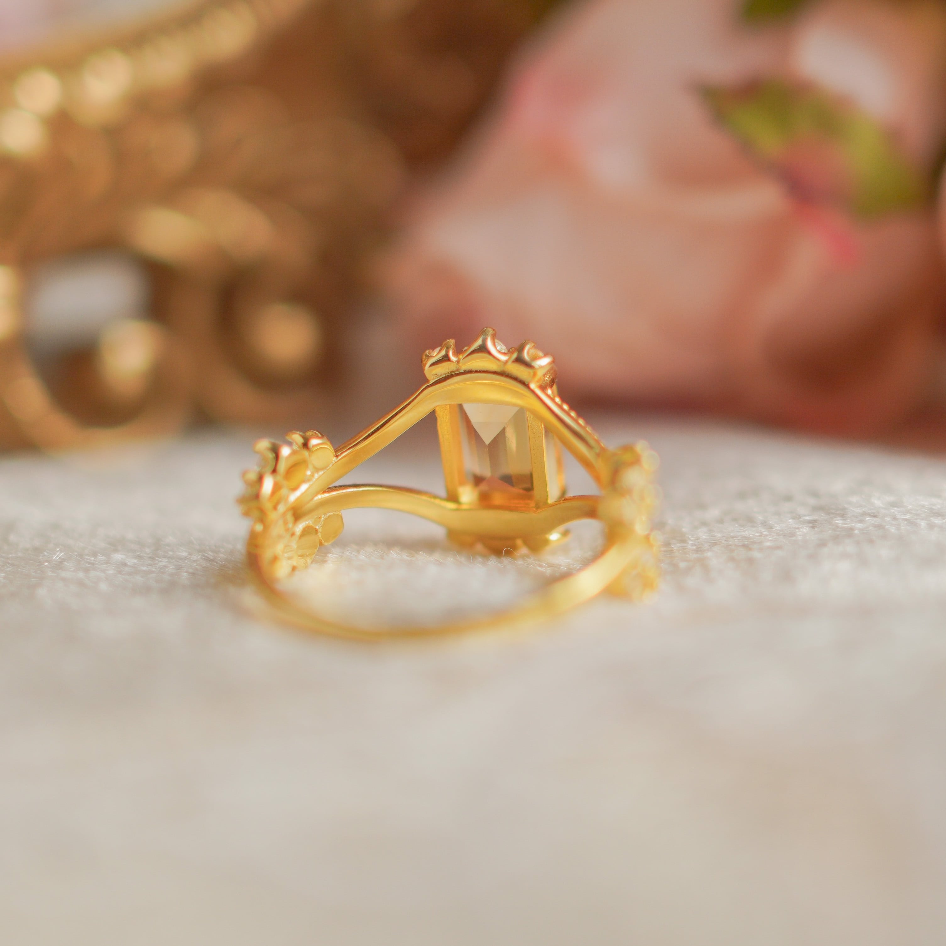 シャンクは中央のシトリンから両側に向かって緩やかに広がる形状をしており、指にしっかりとフィットするため、着用時に安定感があります。夏の爽やかな装いにはゴールドの輝きが涼しげな印象を与え、冬のコーディネートにはシトリンの暖かみがニュアンスをプラスしてくれるので、一年中ご活用いただけるリングとなっております。