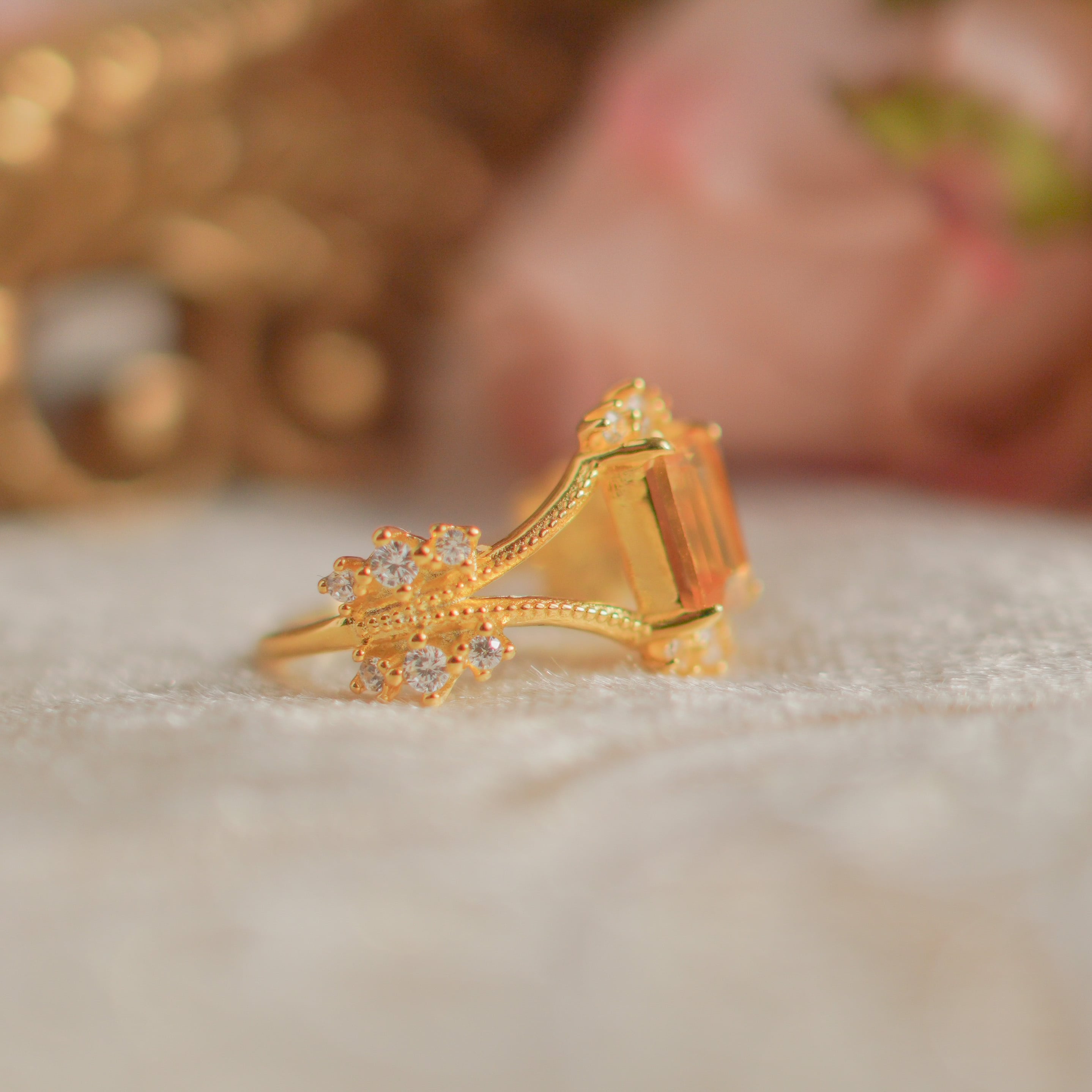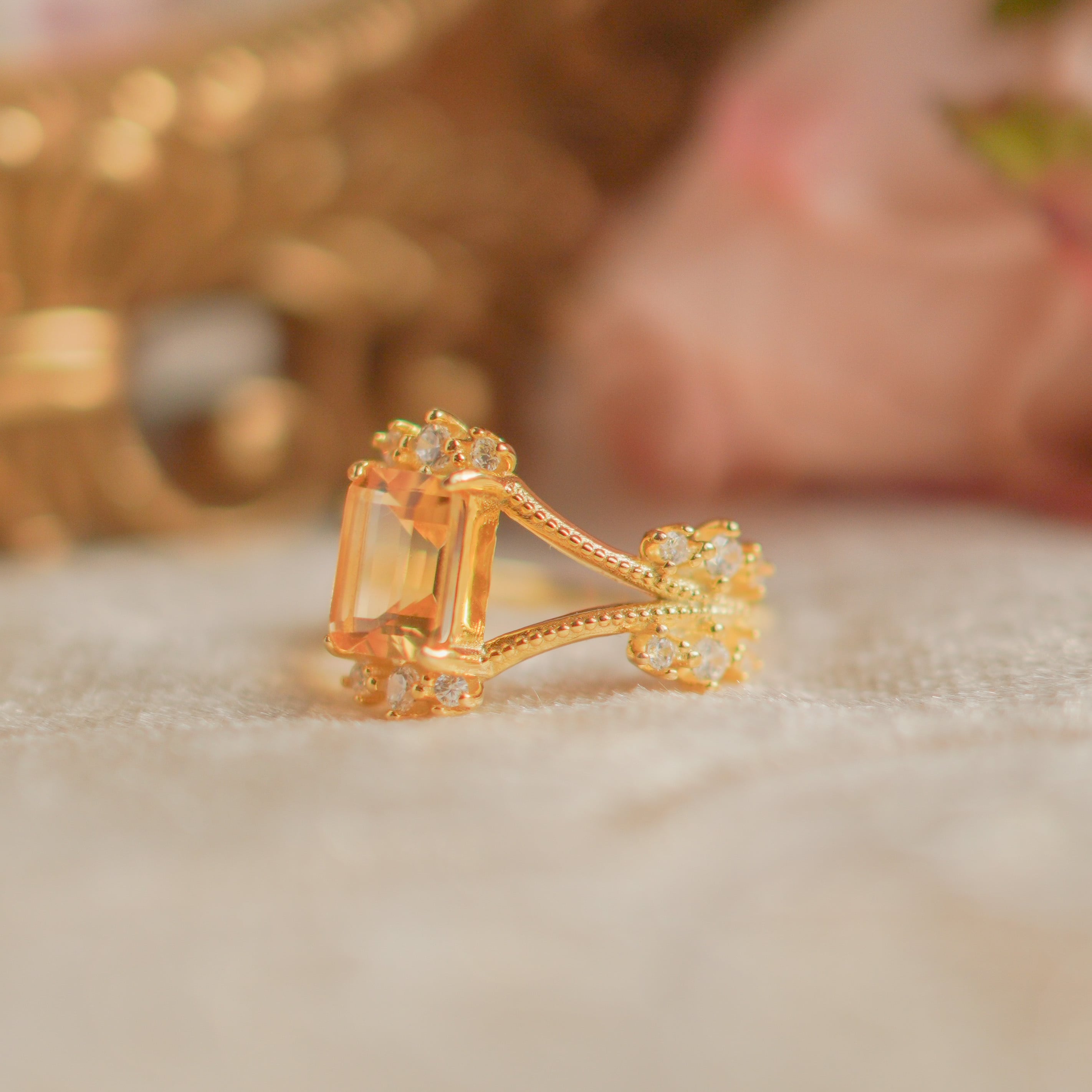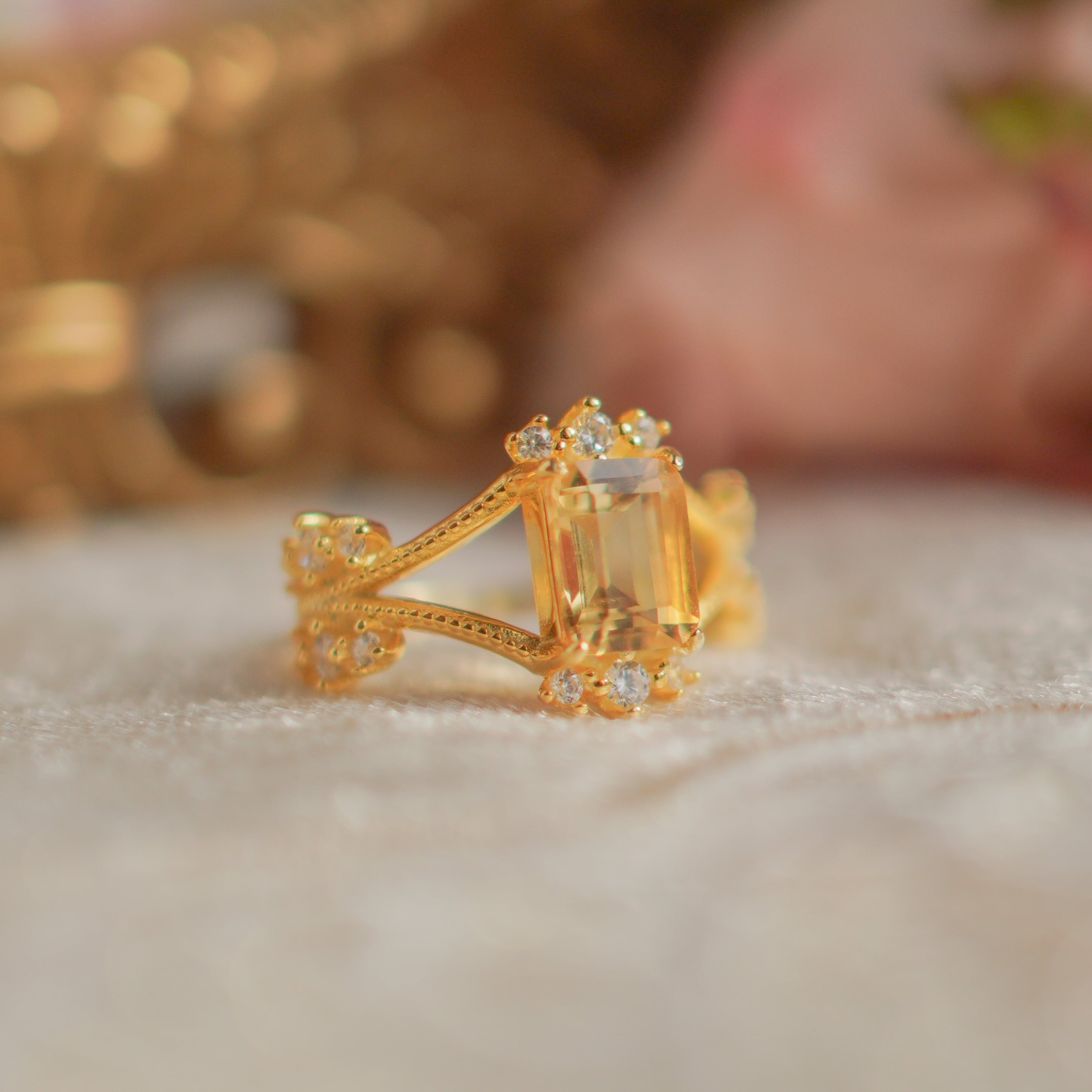 シトリンの美しい輝きと、華奢なディテールが融合し、どんな装いにも華やかさとエレガンスをプラスしてくれるVanessaリング。特別な日の装いにも、日常のコーディネートにもぴったりのリングです。