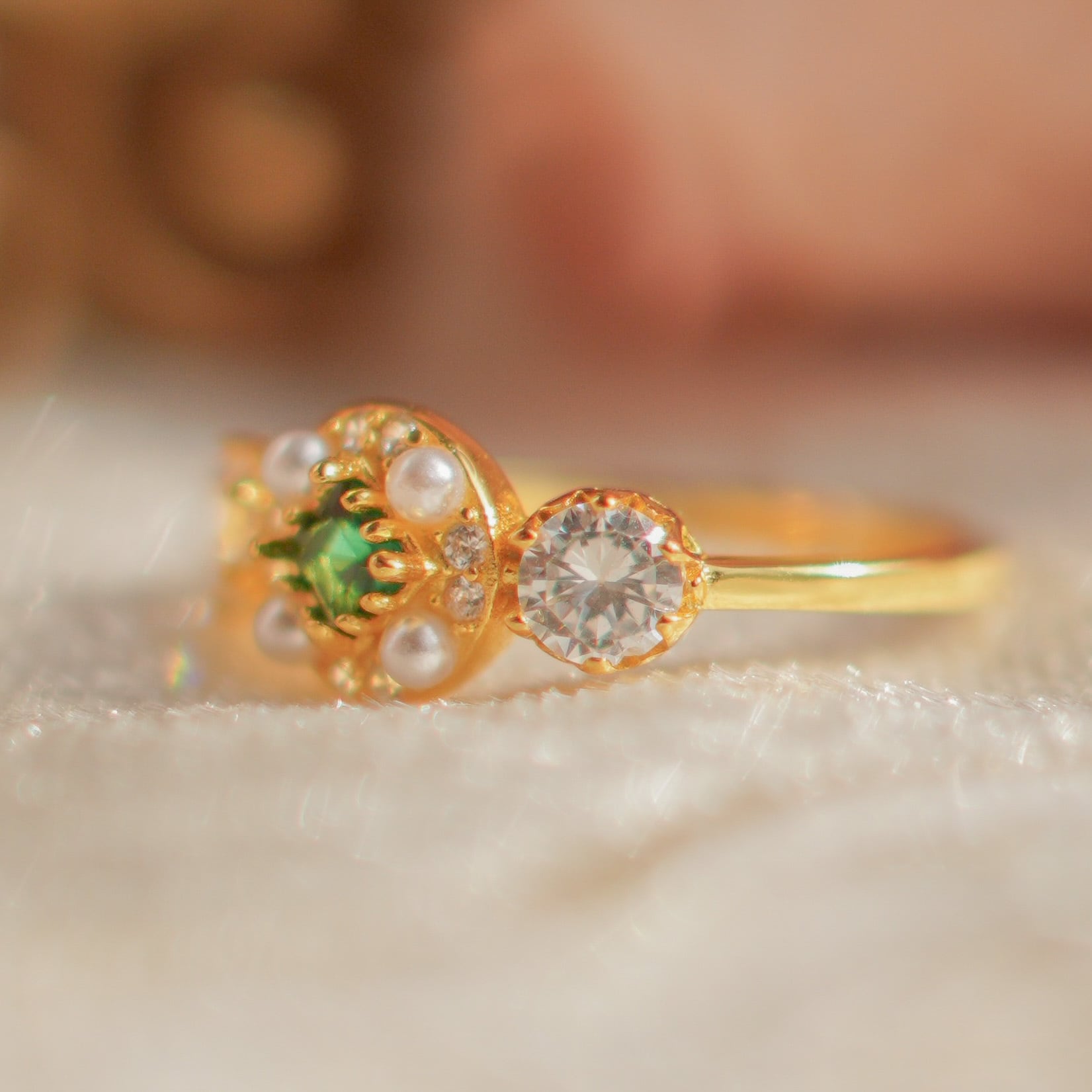 このリングは、中央に美しいグリーントーンのラインストーンを配し、その周囲を取り囲むようにパールとクリアラインストーンが配置されています。あざやかなグリーンは、まるで深い森の宝物のように輝き、パールの上品なホワイトとラインストーンの透明感のある輝きが、グリーンのうつくしさを一層引き立てます。上質なシルバー925仕様なので、長年ご愛用いただけるリングです。