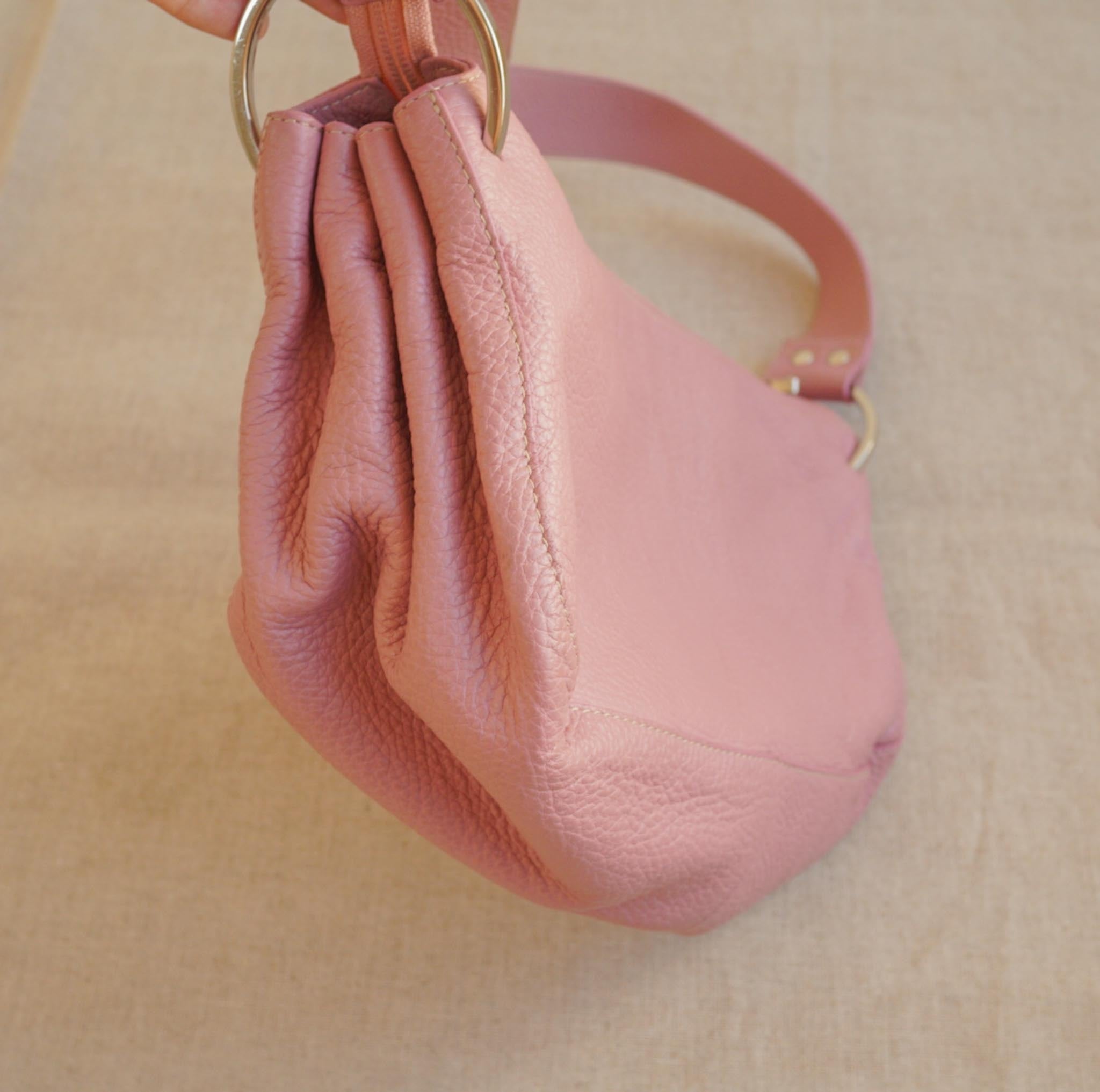 特徴的なショルダーストラップは、幅広でしっかりとしたデザイン。ゴールドのメタルリングとリベットが、全体の柔らかさにエッジを効かせ、バランスのとれたルックスを演出しています。バッグのサイドにはプリーツのディテールが施され、立体感と動きを与え、シンプルなフォルムにユニークなニュアンスを加えています。
